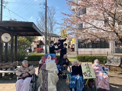 今回は、公園の青空の下で凧あげを行いました♪想いを込めた凧が青空に向かって飛んでいく姿をぜひ見て頂きたいという職員の想いがありました。「上手く飛ぶやろかぁ」と凧あげを行う前に興味津々な利用者様がたくさんおりました(*^_^*)実際、凧あげを行うと思った以上に上手く上がらず…( ノД`)シクシク…「両方に足をつけなあかんのやぁ」と利用者様からアドバイスを受ける職員一同。利用者様の声を参考にして再挑戦!!すると、上手く上がったとは言えませんが、先程よりもキレイにあがりました!(^^)! その光景を見て、「うわぁ!」「あがった、あがった」と大変盛り上がりました♪