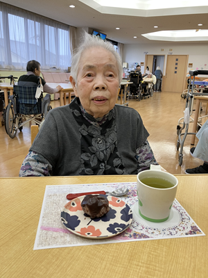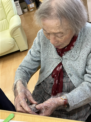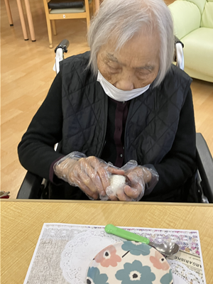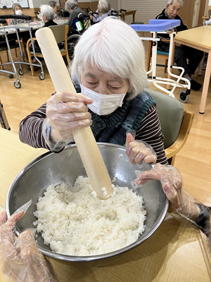 手慣れた感じでもち米を突き「もう少しかな」「結構力がいるわ~」など言いながら。次はこねていきます。優しく丸めて「なんか懐かしいの」「もうおいしそうやわ」手も口も動かしながら、あんこを付けて出来上がり。