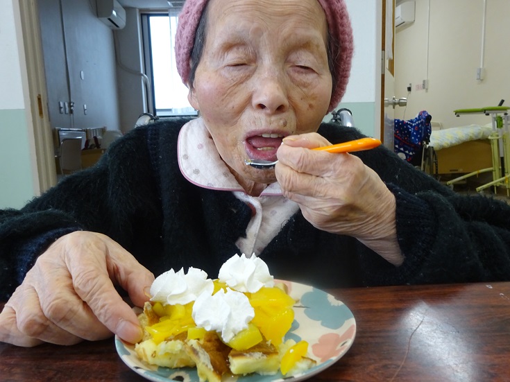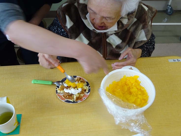 生クリームや、みかん、桃、はちみつをたっぷりかけて食べていただきました(^^♪