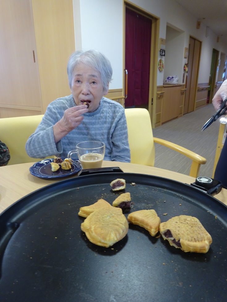 4名の利用者様に分かれてホットプレートの上にたい焼きをおいてパリパリになるように利用者様に焼いて頂きました。(*´ω`)