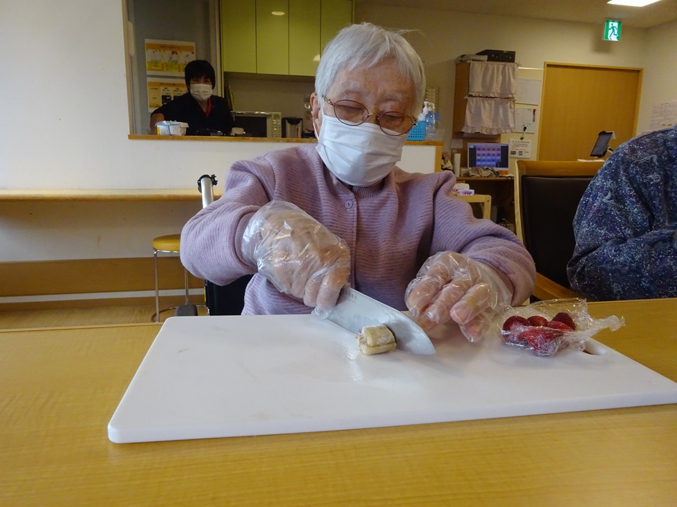 利用者様にフルーツのスライスをお願いしました。前日から冷凍してあったので、