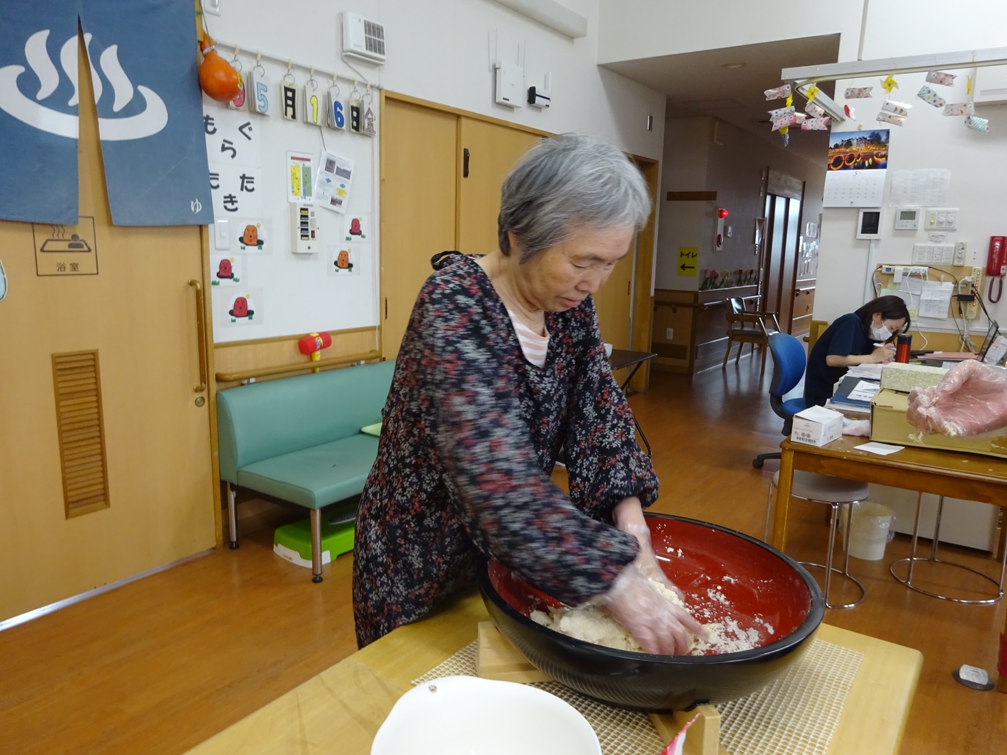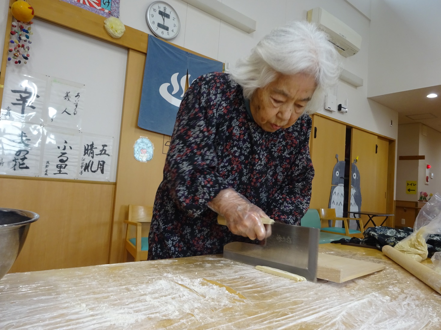 フロア行事で手打ちうどん作りをしました。