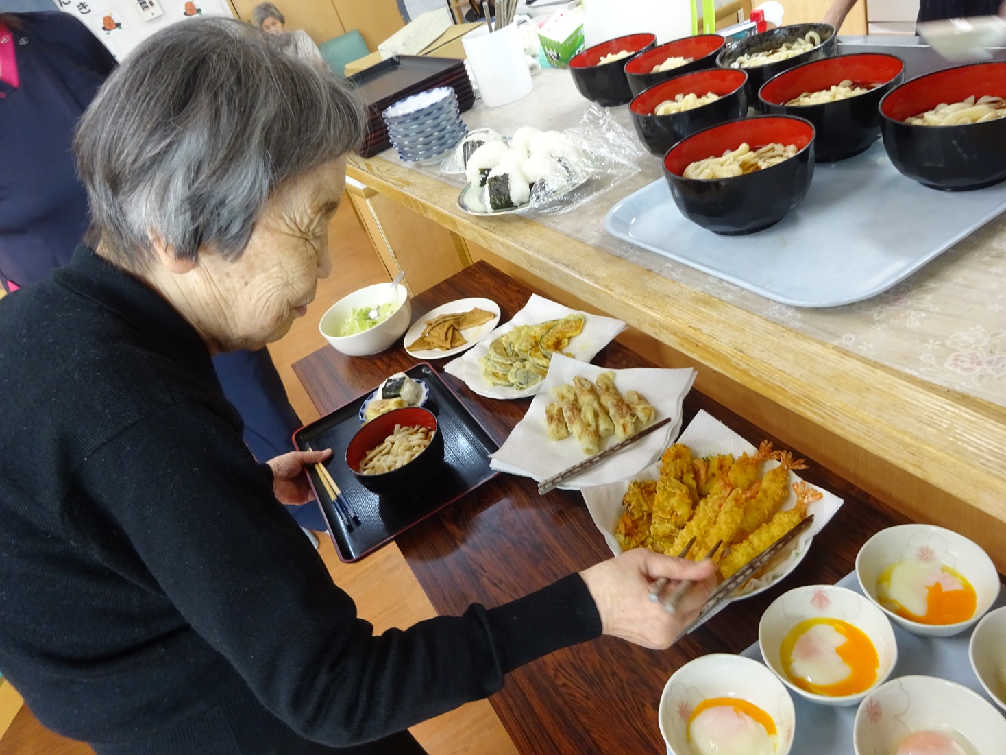 「全部食べたいわ!」と天ぷら、おにぎりなど全部乗せされる方ばかり。すごい食欲です(拍手)