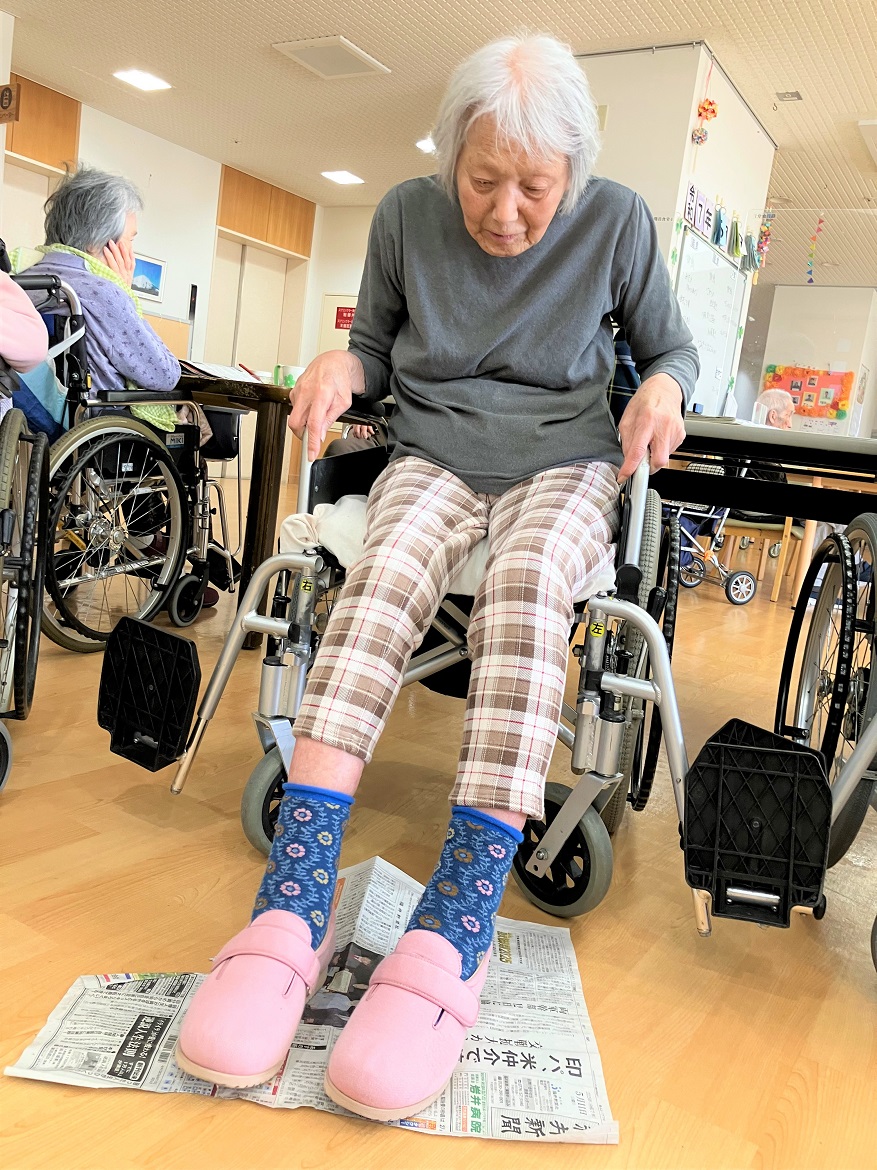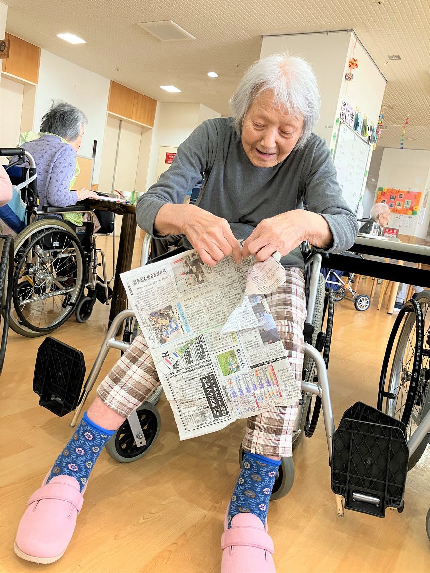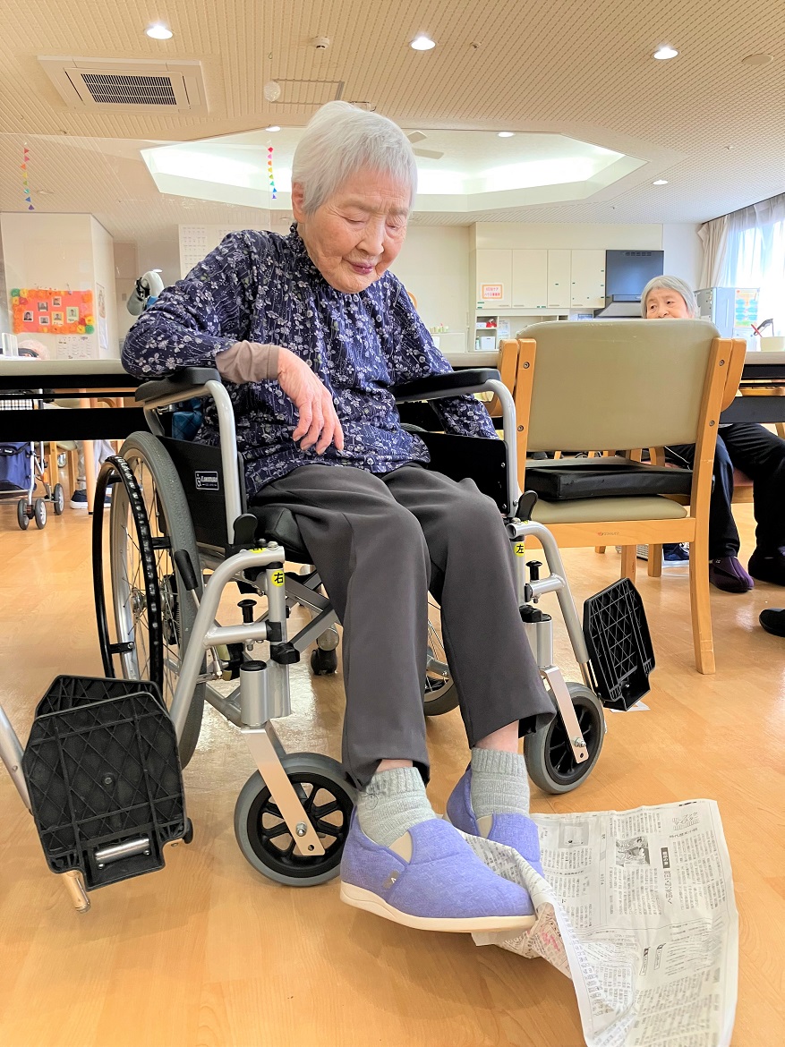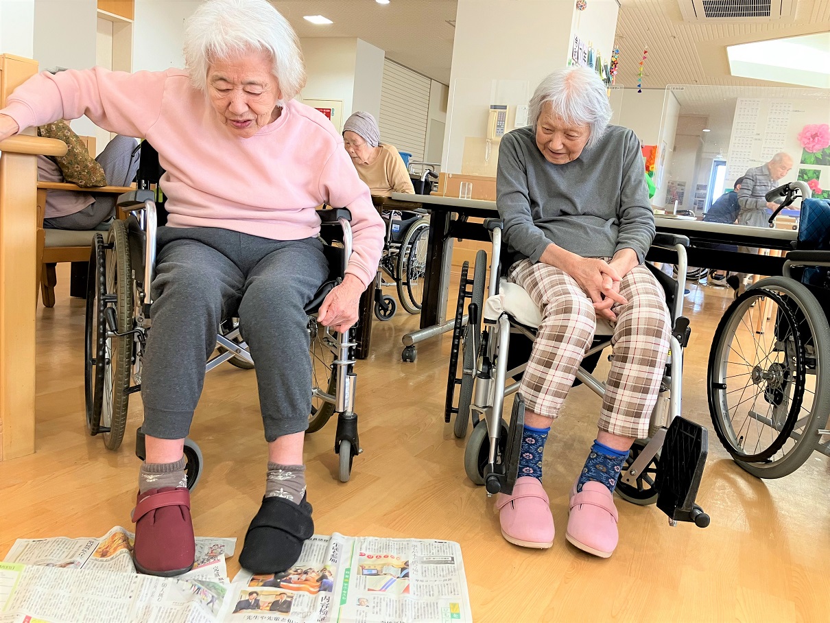 本日のレクリエーションは、「手を使わずに足だけで新聞紙を折ったり広げたり破ったりしてみよう」です♪