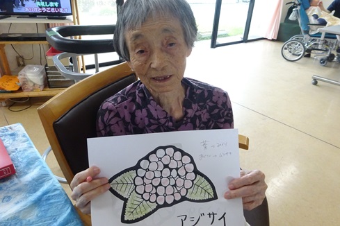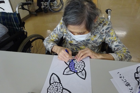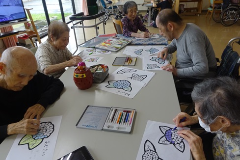 今月は塗り絵が好きなご利用者様にピンク・青・紫のあじさいを塗って頂いています。ピンクにオレンジ色を組み合わせたり、紫と青色を塗り合わせたりと、工夫されている方もいらっしゃり、完成が楽しみです!装飾活動が終わった後に「ごはんまだかな」とお腹を空かされている方もいたり…。