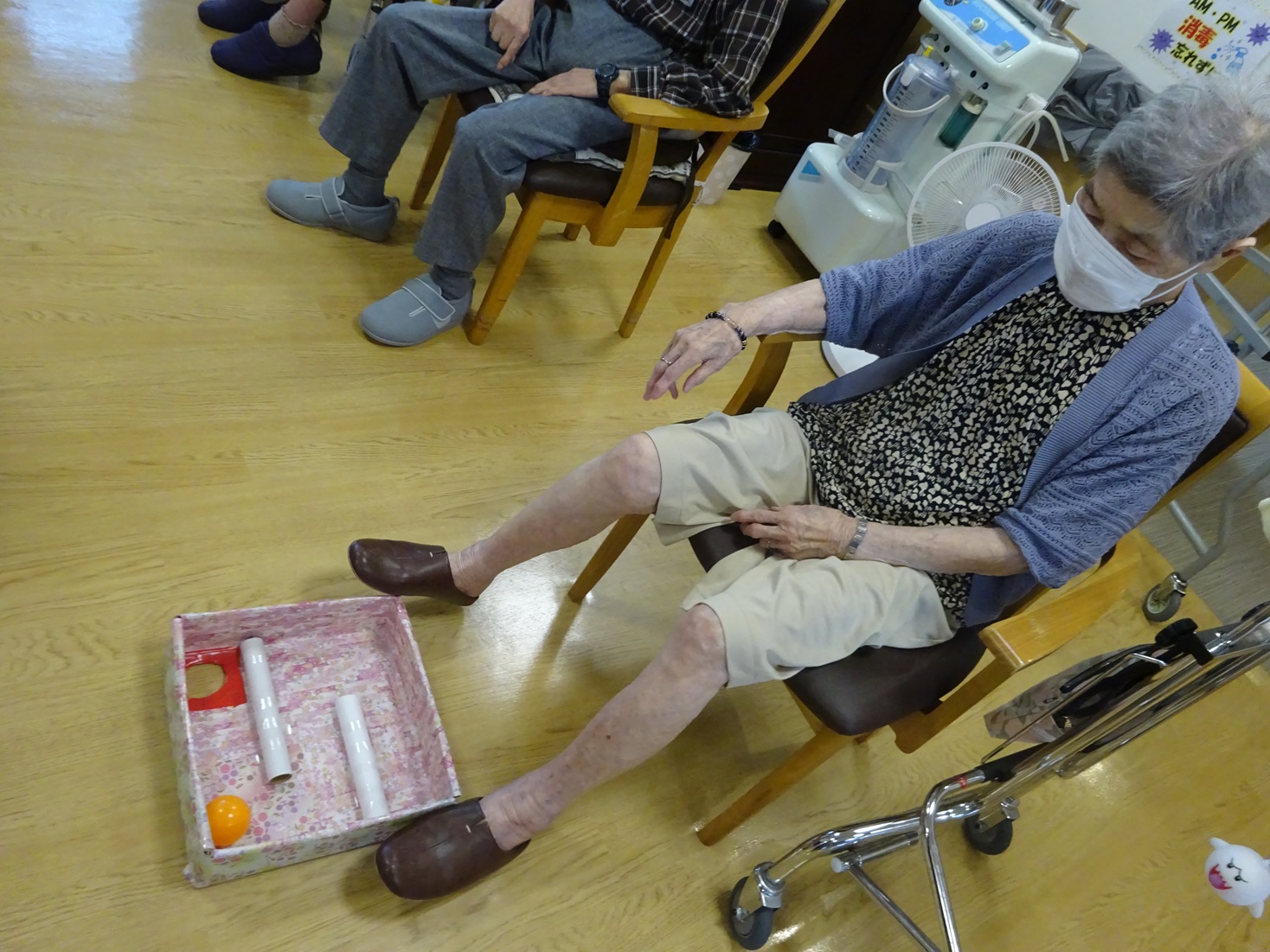箱を迷路のようにして、足で動かしてボールをゴールの穴に