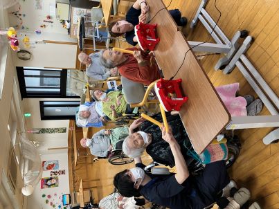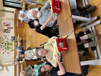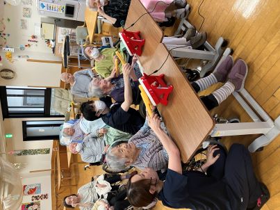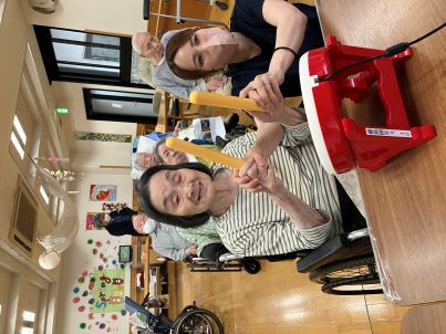 ご利用者様と職員がペアになって叩いたり、応援し合ったりと、ご利用者様と一緒に「楽しい!」を共感することができました!