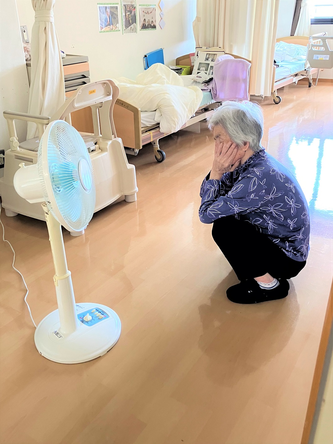ご利用者の居室の前を通りかかると扇風機独占状態(笑)