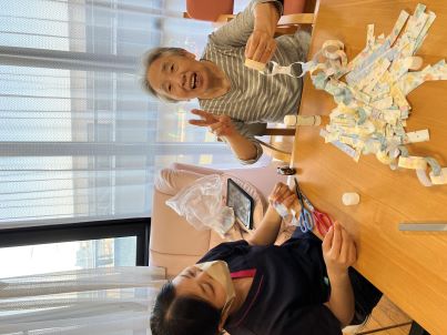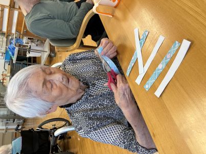 もうすぐ七夕!季節の行事を感じていただけるように、ご利用者様と一緒に七夕の装飾作りをしました。色とりどりの折り紙を使って、飾りの輪つなぎを作り、皆様とても集中して取り組まれていました☆