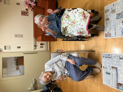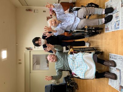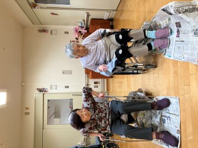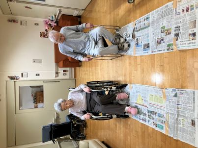 今回のレクリエーションは、ちょっぴりユニークな競技「足で新聞紙引き競争」を行いました(*^^)v「え~足でやるの?」「これは難しいわ~」なんて最初は笑いながら始まったこの競技ですが、いざスタートすると皆さん真剣そのもの!新聞紙が少しずつ足元に近づいてくると、「もうちょっと!」「がんばれ!」と自然と応援の声も上がりました!(^^)!思ったよりも足を使う動きに、「いい運動になったわ」と笑顔でお話しをされる方も多く、終わった後は、皆さん清々しい表情をされていました。