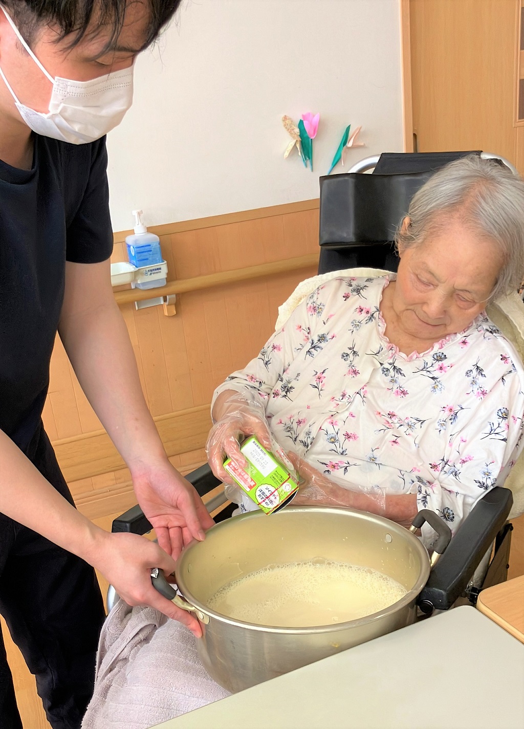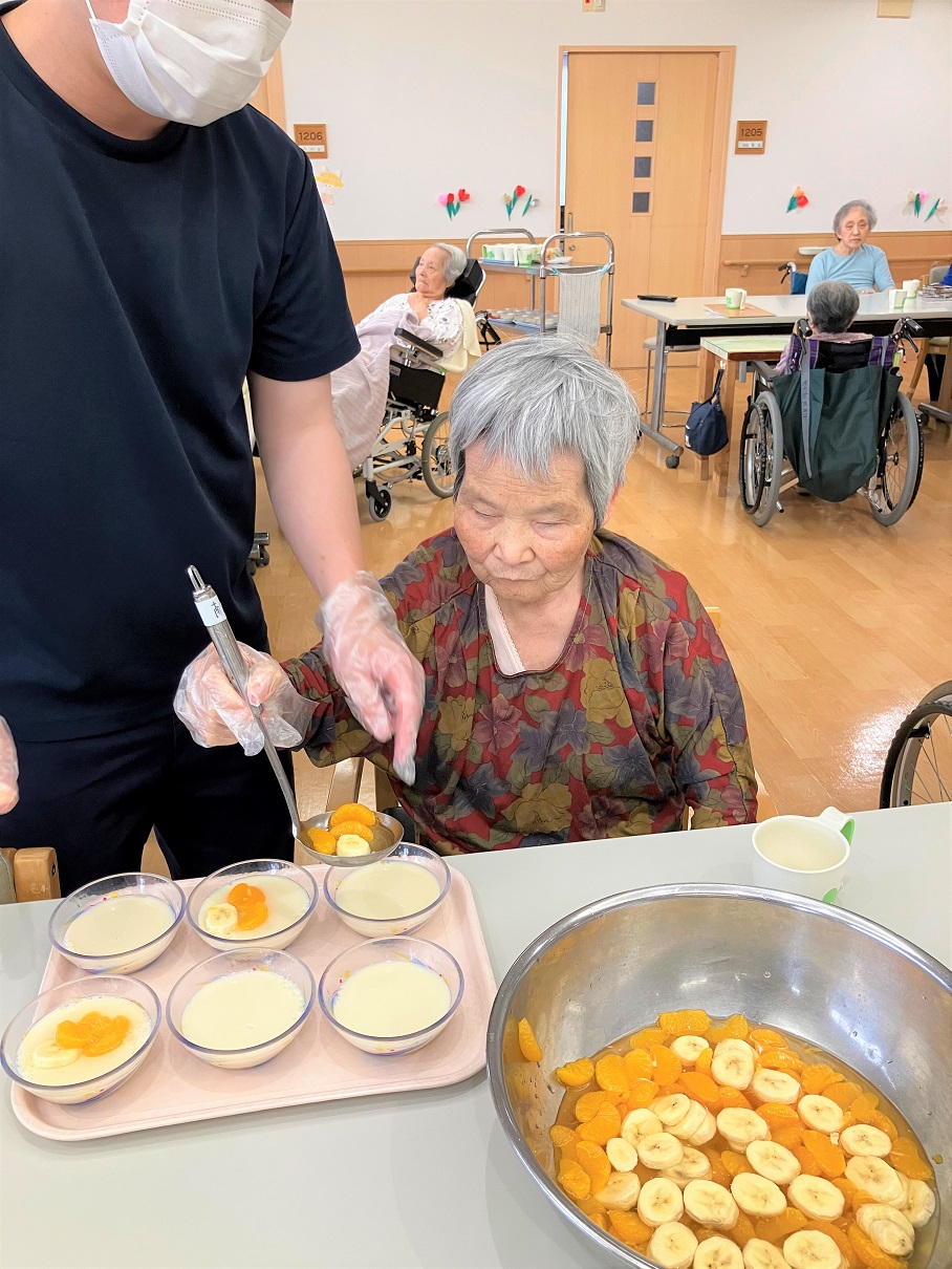 鍋に入った豆乳を混ぜたり、フルーツの盛り付け等を手伝って下さいました。豆乳を混ぜている時は、皆さん楽しそうにしていました(^^♪