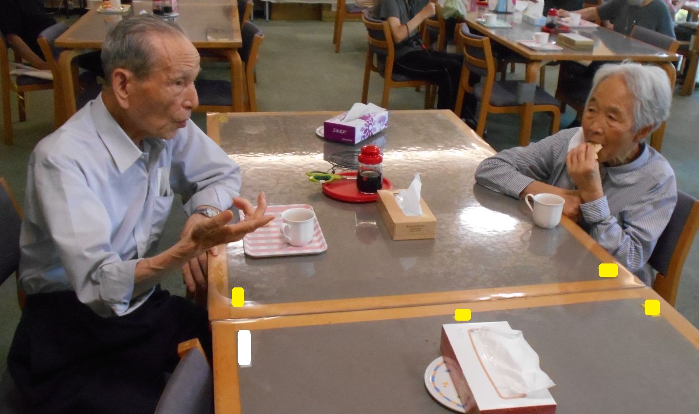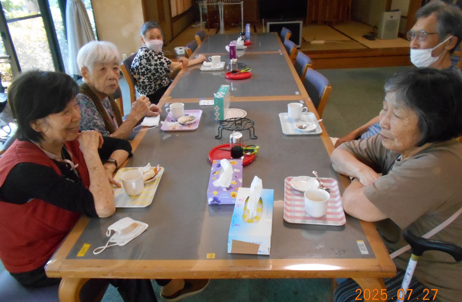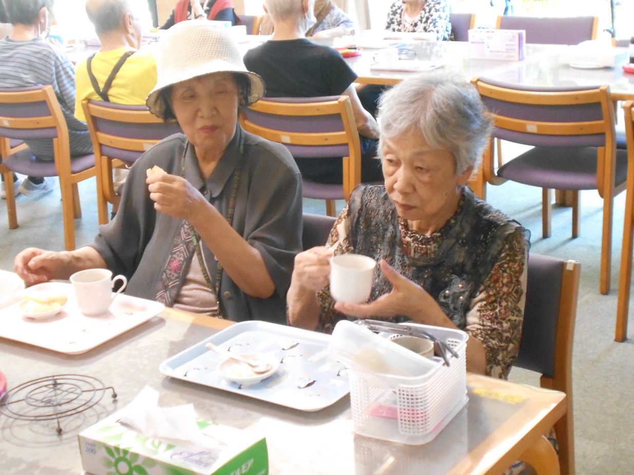 7月13日~22日までエレベーターの改修工事を行っていましたが、ようやく終わりました。そこで「おつかれさま会」として喫茶会を行いました。エレベーターの改修工事中、階段を使用して「足の力がついたわ~」などのお話も聞かれました。