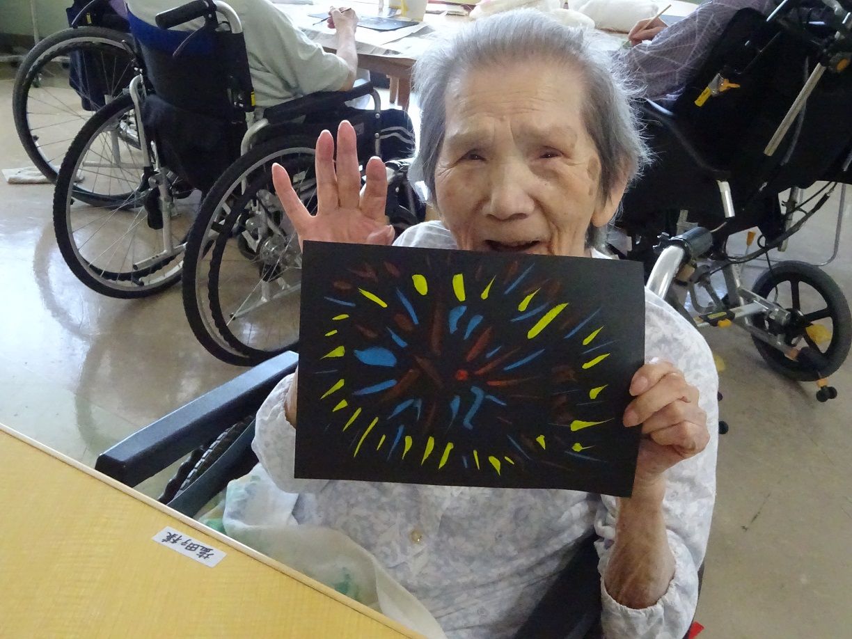 今月のフロア行事は、8月ということもあり花火の絵を皆さんに描いていただきました。多彩な色で描いている方や迫力のある大きな花火を描くなどそれぞれ個性的な花火の絵になりました。