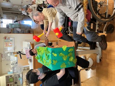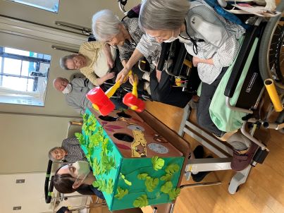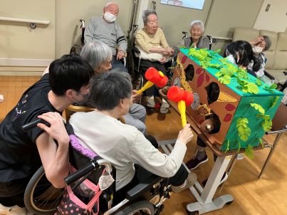 ご利用者様は始まる前からピコピコハンマーを振って臨戦態勢!!もぐら役の職員の腕はプルプル状態…