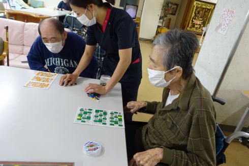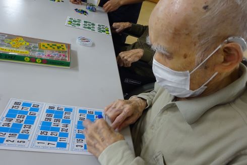 ロトとは日本のビンゴに近いゲームです。職員が数字を選び、利用者様は配布されたカードから数字を探します。数字が見つかったらおはじきをのせ、横に1列5つのおはじきが乗った方の勝ちです!!「ないな~」「あった!」など利用者様も真剣な表情。3回戦しましたが終わってみると「楽しかった」と喜ばれていました(*^^)v