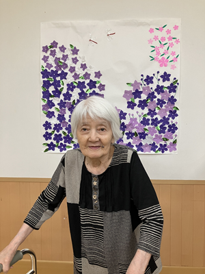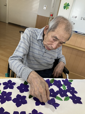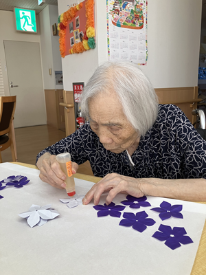 桔梗の壁飾りを作りました。糊をつけて貼り方にも皆様の個性が出ます。花びらの端っこまでたっぷり糊を塗る派、ちょんちょんっと2、3か所に糊つけする派。貼り方も、色々です。両手で同じ角度に並べて貼る派、将棋を指すように片手で貼る派。おかげ様で爽やかな秋の花と赤とんぼの壁飾りができました。早く涼しくなってほしいです!