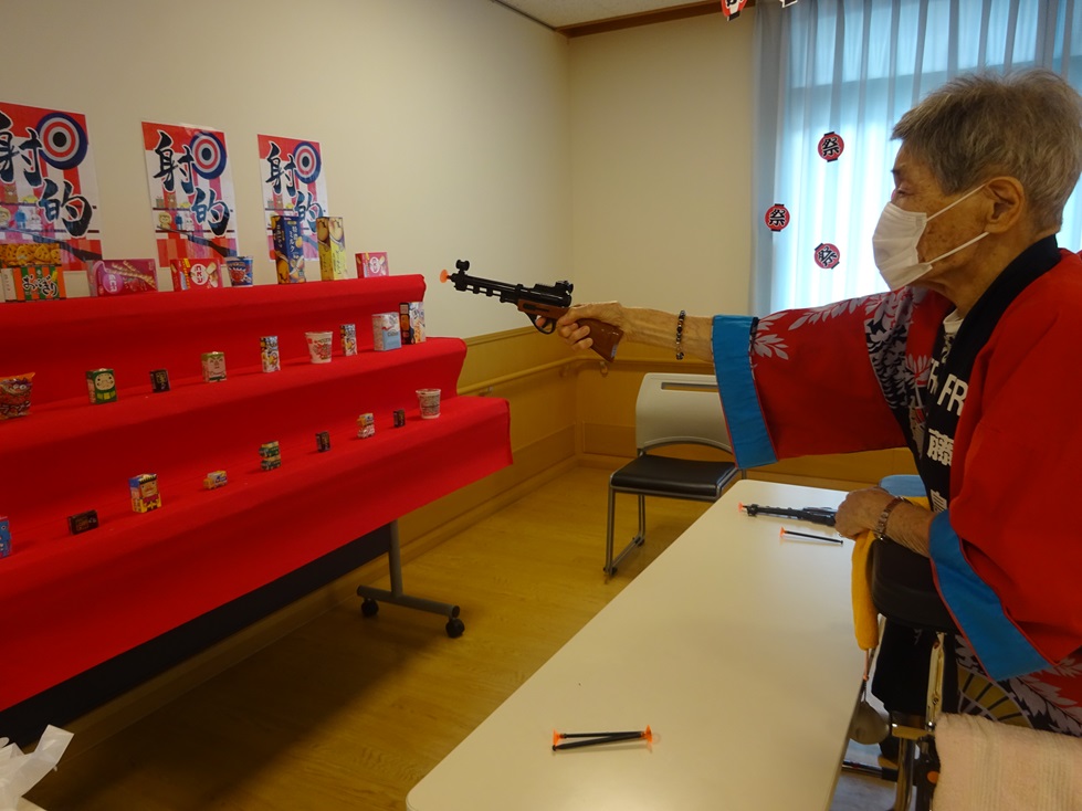 まずは職員と一緒にゲームコーナーを回り、中でも人気な射的では皆さん好きなお菓子を狙って「当たったー!!」と嬉しそうにされている姿が見受けられていました(*^-^*)/