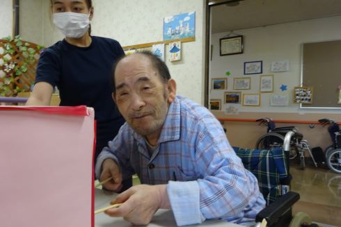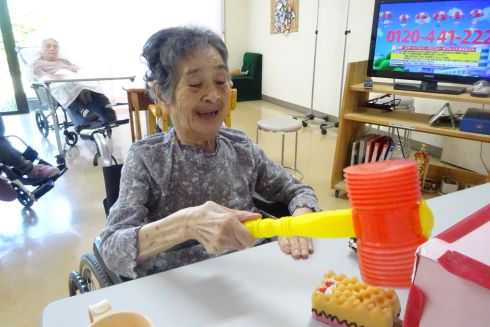 手作りで製作した物で、ご利用者様と一緒に笑いながらゲームを楽しんでいました。スポンジで作ったワニの頭が出てくると思いっ切りハンマーでたたく利用者もいれば「可哀そうやわ~」と言って優しく叩かれる方もいらっしゃいました。