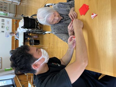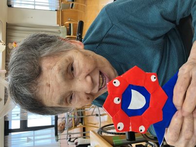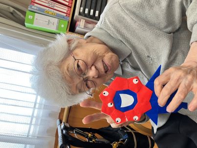 本日はご利用者様と一緒に、2025年大阪・関西万博の公式キャラクター「ミャクミャク」を折り紙で作りました!
