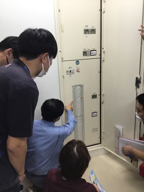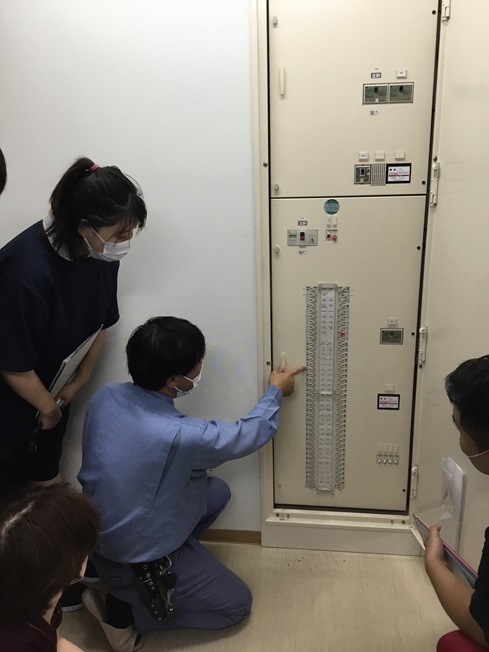 18日に北陸保安協会のそよかぜ担当者を迎えて、緊急時(地震、水害など)の停電に備えた知識と復旧作業の仕方について指導をして頂きました。電気の流れや配電盤の位置および操作の仕方を平時から学ぶことで緊急時でも焦らず行動する、また利用者様に安心して頂けるようにというのが目的です。