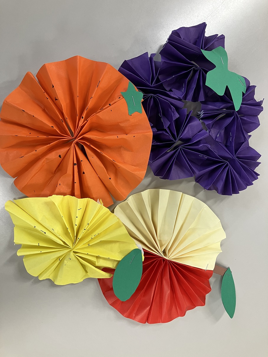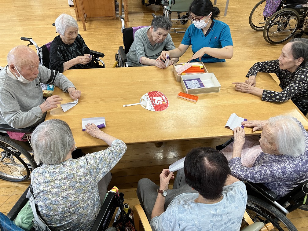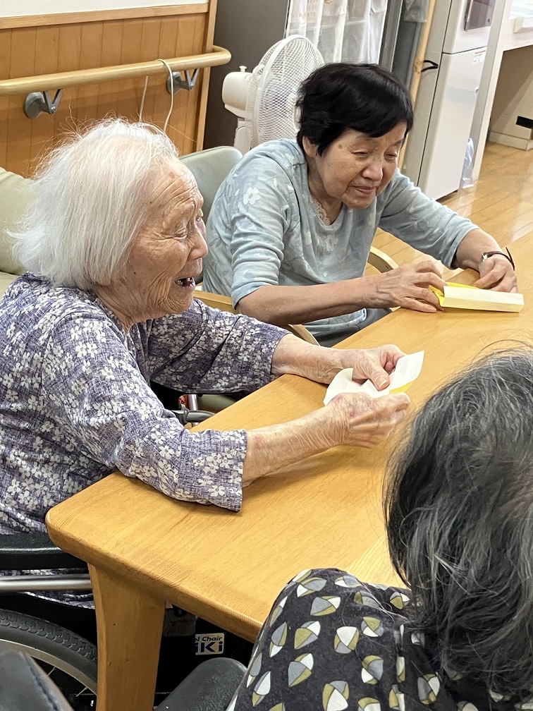 壁に貼る飾りを折り紙で作りました!!指先の作業が苦手とおっしゃる方もおりましたが、いざ折ってみるときれいな蛇腹折りができました☆彡葉やへたを付けて完成しました!!おしゃべりをしながら行い、楽しい時間を過ごました(⋈◍>◡<◍)。✧♡