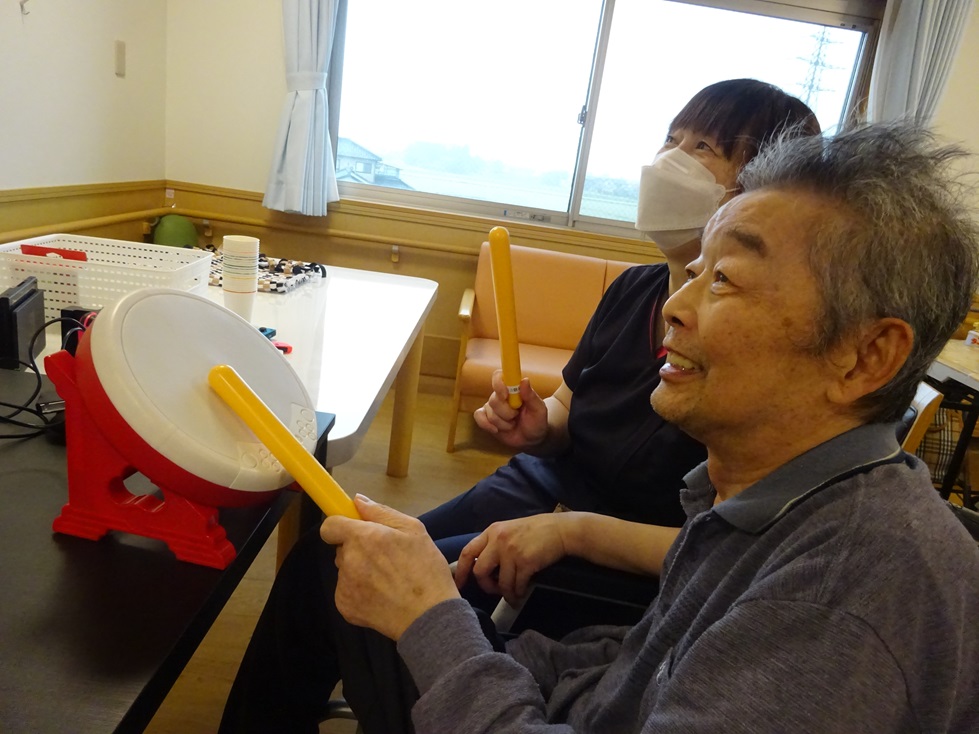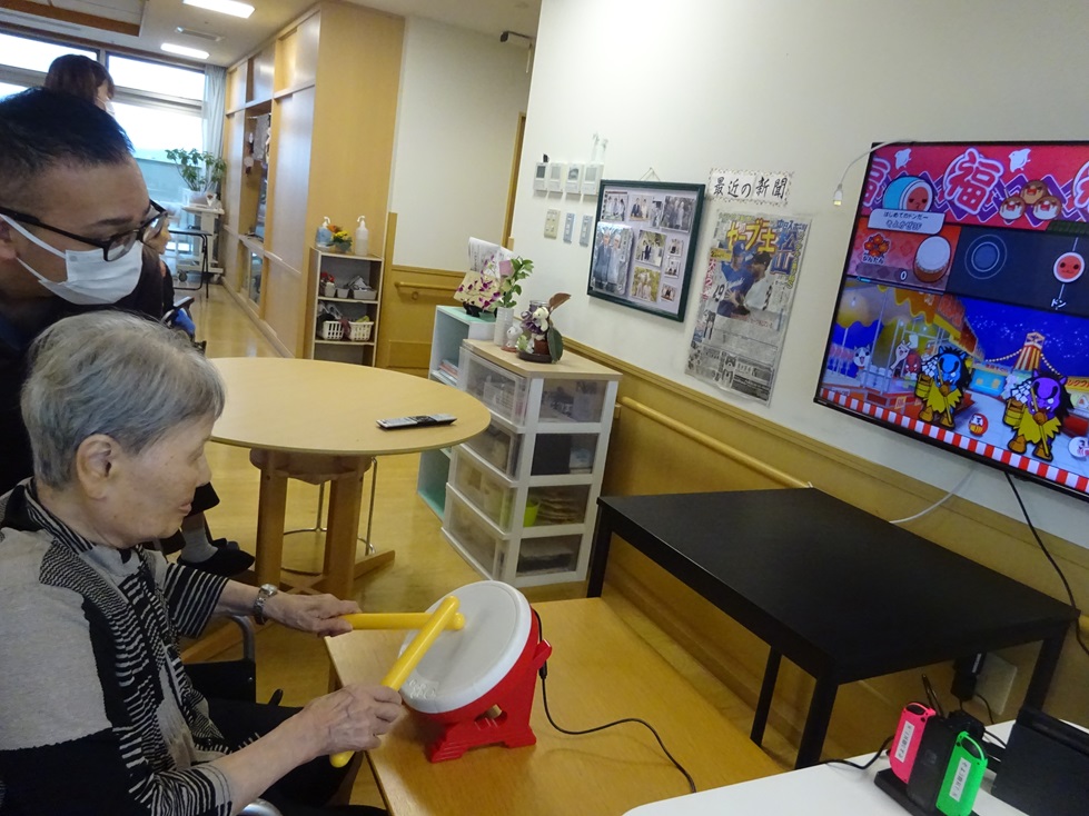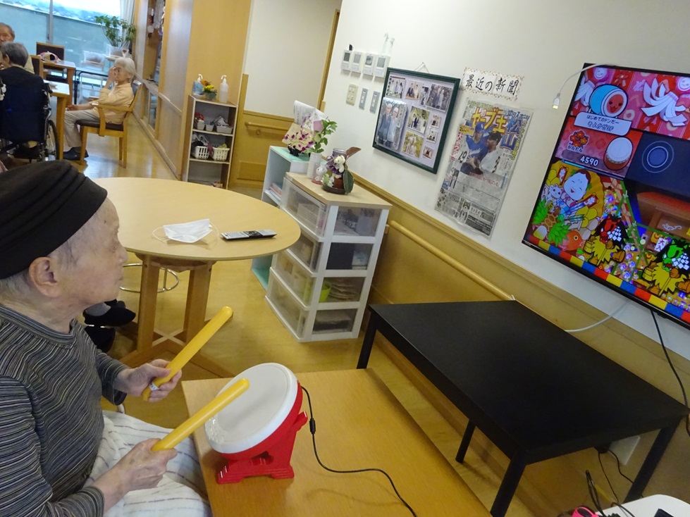 そよかぜホーム3階ユニットです!太鼓の達人というゲームをしました(*'ω'*)皆さん、太鼓なのでなじみがあるのか上手にたたいておられ、思わず、笑みがこぼれていました(*^^*)