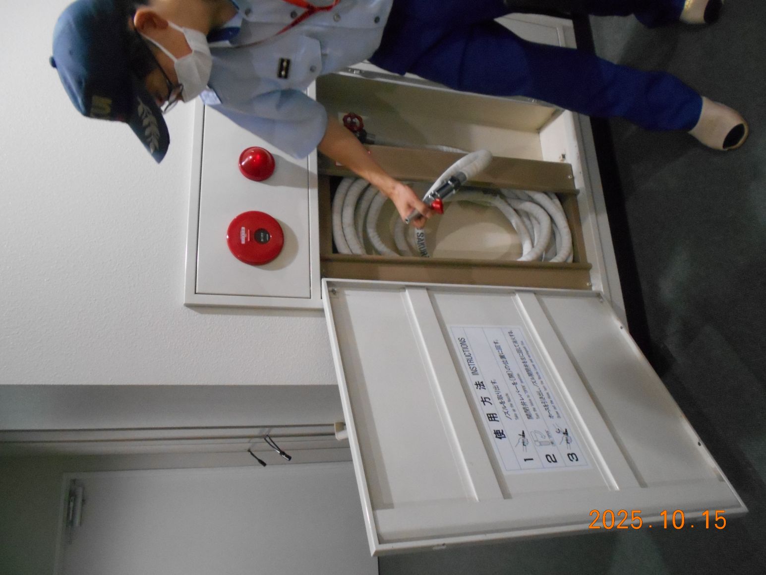 火災警報が作動してから初期消火・避難誘導・消防署への通報を実践しました。