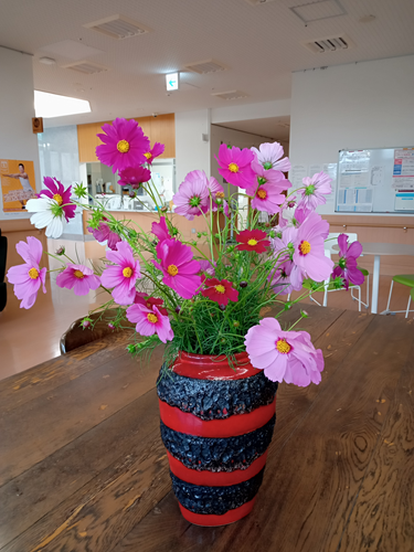 コスモスを見に行ってきました。あいにくの曇り空でしたが、雨に降られることもなくコスモスを堪能できました。満開のコスモスに皆様 ためいき すがすがしい空気を存分に吸い込み リフレッシュ! 見るのもいいですが、すかさずお持ち帰り用のコスモスを手にされていました。 バスに戻ったとたんに雨が落ちてきて間一髪。日頃の行いが良い皆様でよかったです。落ち帰ったコスモスはロビーに生け 外出に行けなかった方々も口々に「きれいやの~」と喜んでおりました