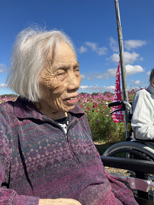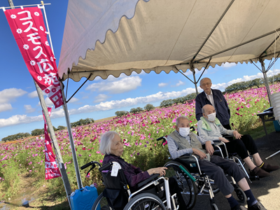 宮ノ下コスモス広苑へドライブに行きました。前日夜から朝まで雨が続いていたので、車窓から眺めるドライブかも…と心配していましたが、出発時間には青空がひろがってくれました。眩しいほどの日差しの中、秋風にコスモスが揺れるのを眺めることができました。利用者様は、お散歩する園児たちと「こんにちは」と元気よく挨拶しあって、楽しいドライブになりました!