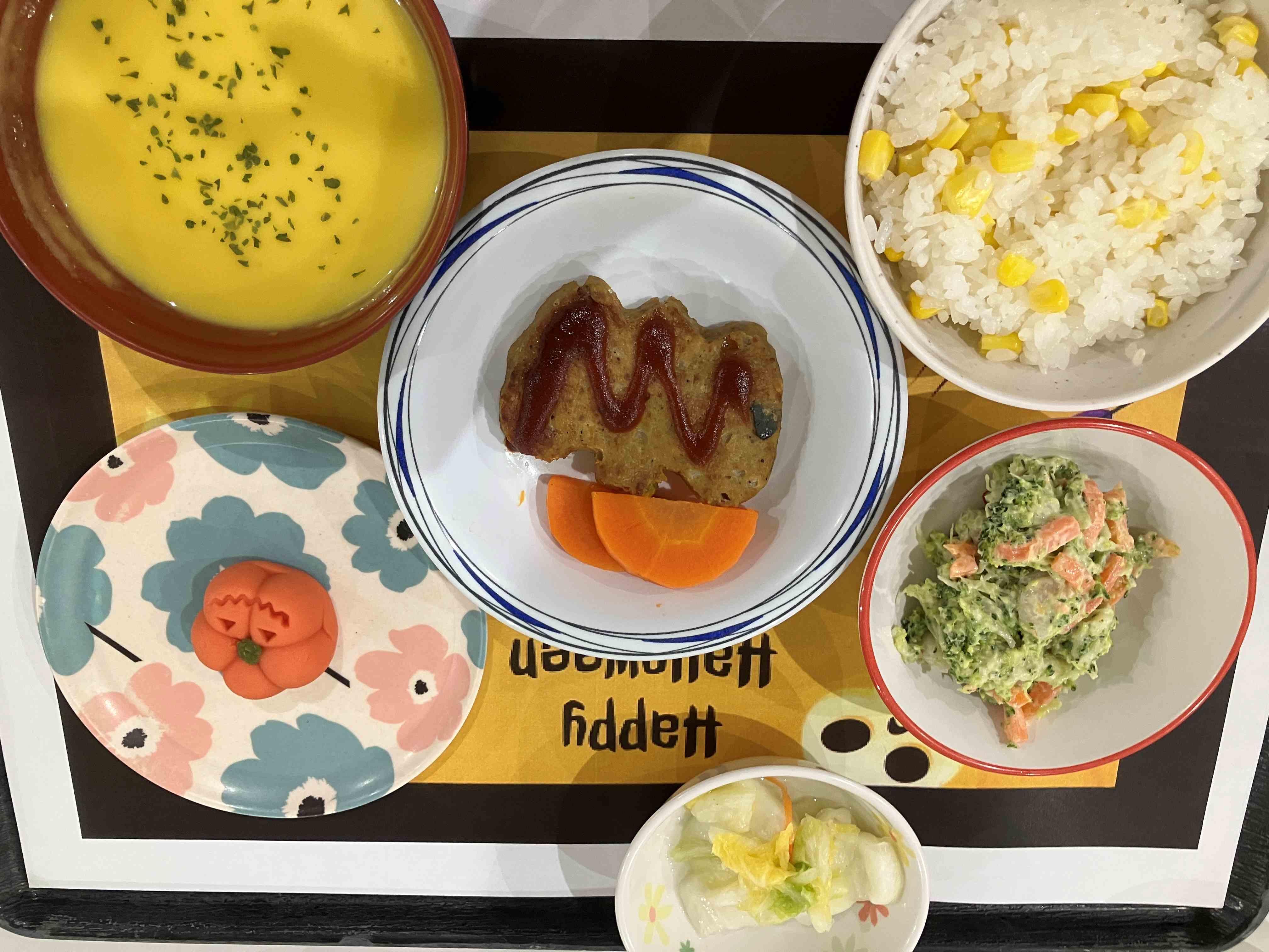 【とうもろこしご飯・ハンバーグ・海老とブロッコリーのサラダ・パンプキンポタージュ】です。