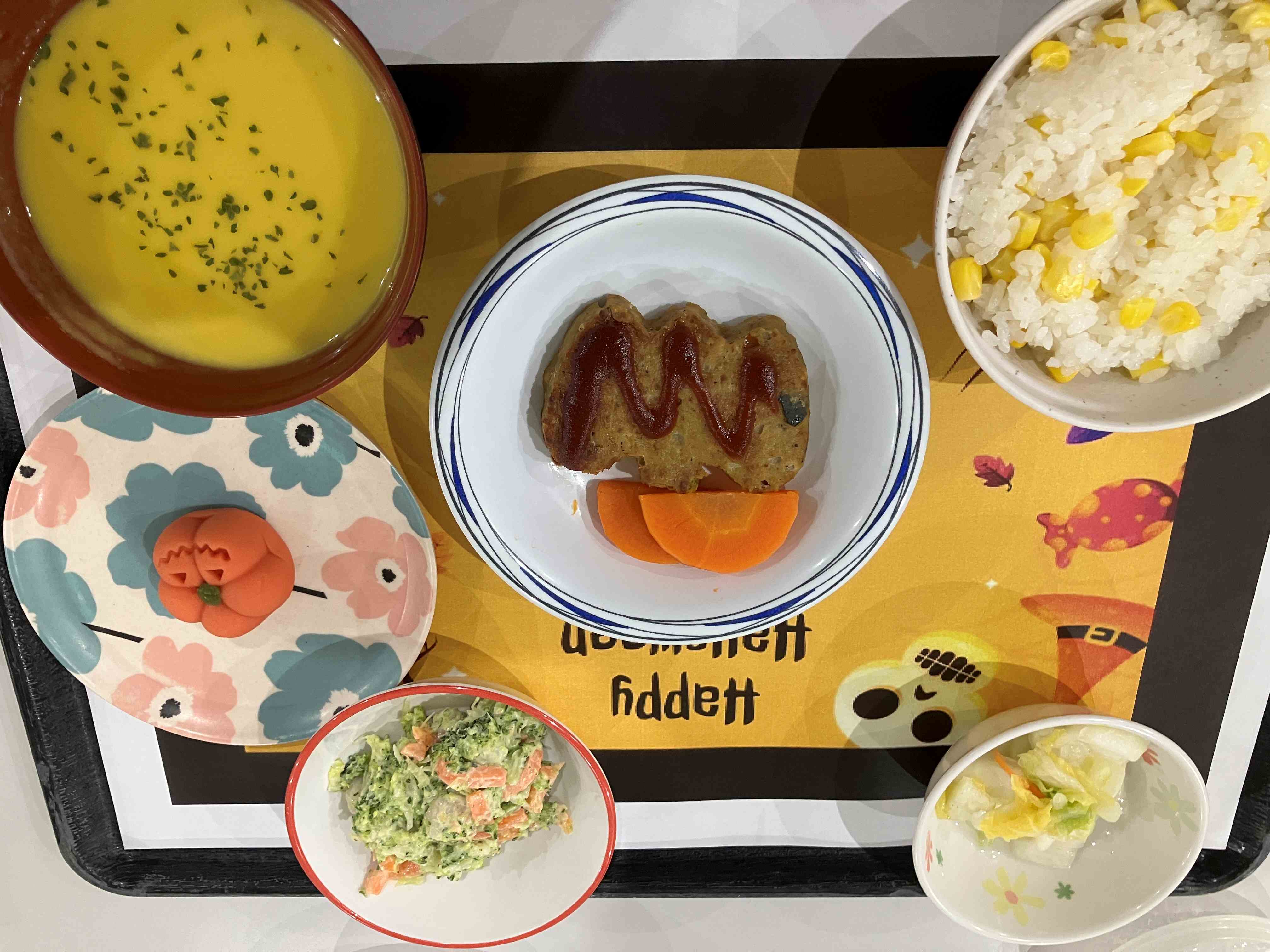 かぼちゃ型のハンバーグや新しくメニューに取り入れたパンプキンポタージュ、