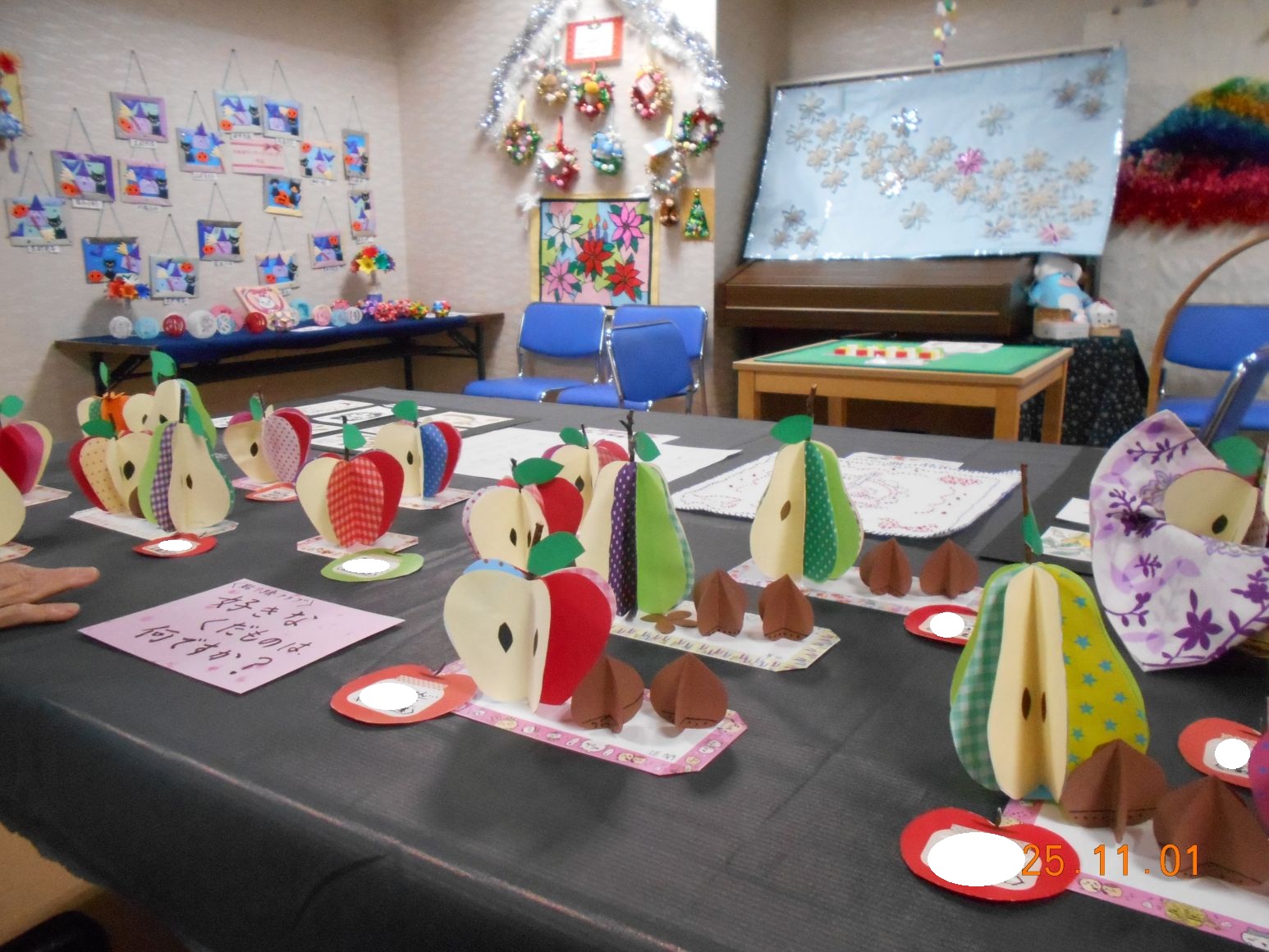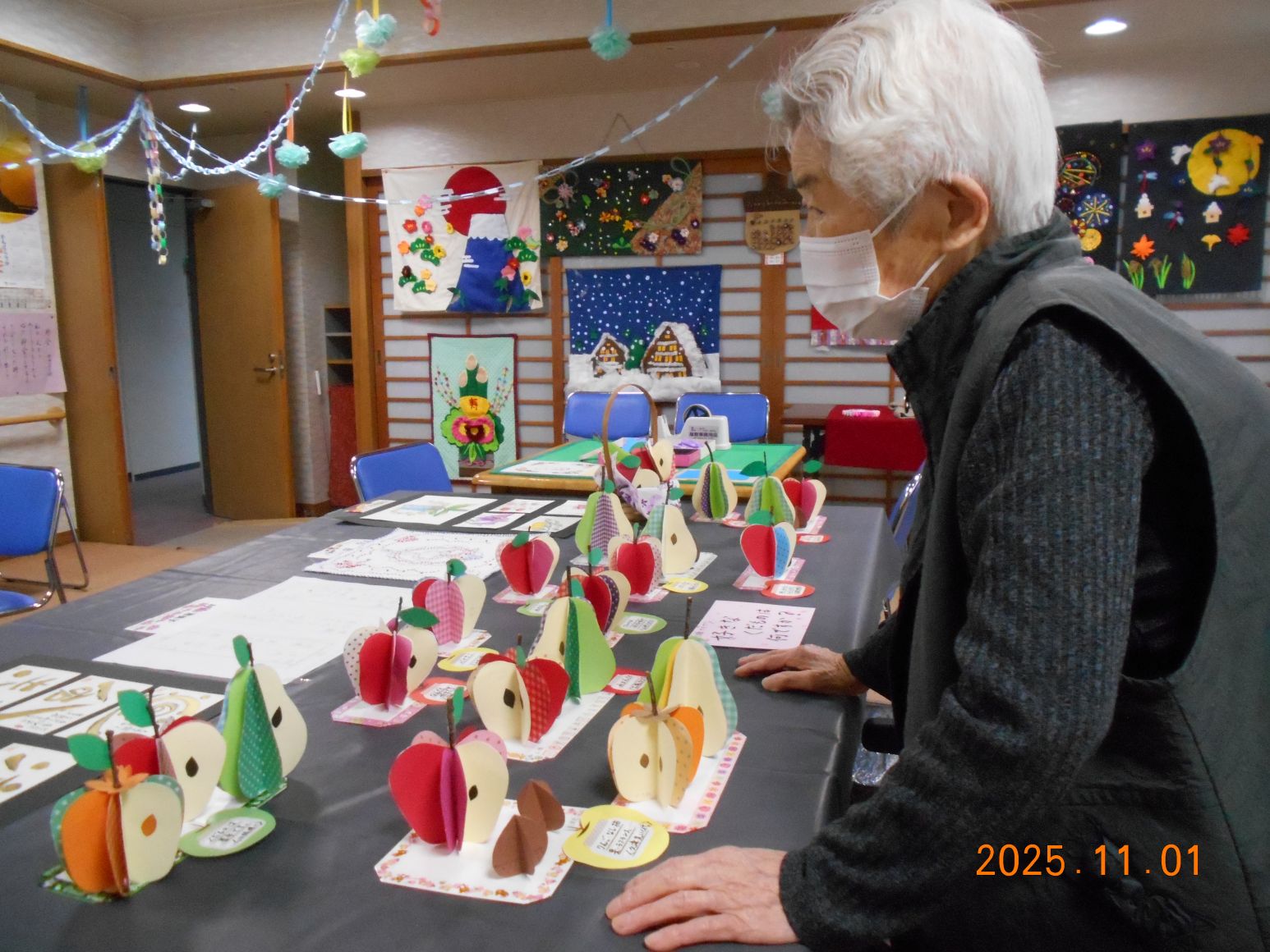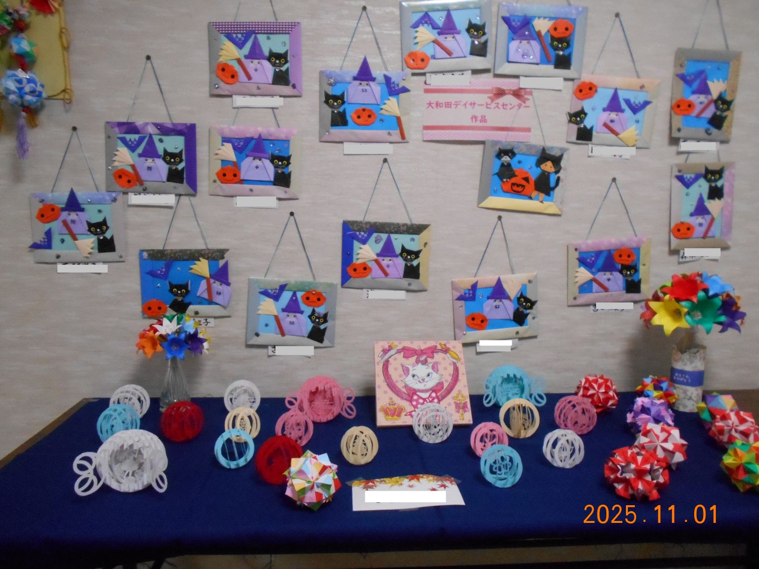 ケアハウス入居者と、デイサービスご利用者の作品を、2階多目的室で展示しています(*^_^*)