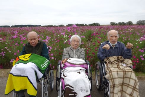 公苑に到着するとコスモス畑は一面、紫色やピンク色、白色のコスモス畑が満開に咲いており車を降りて一言、皆様「寒いね、でも綺麗に咲いてるね」と嬉しそうでした。帰り道、久しぶりの外出に皆様疲れた様子でしたが、「行って良かったね」と満足そうに話されていました。