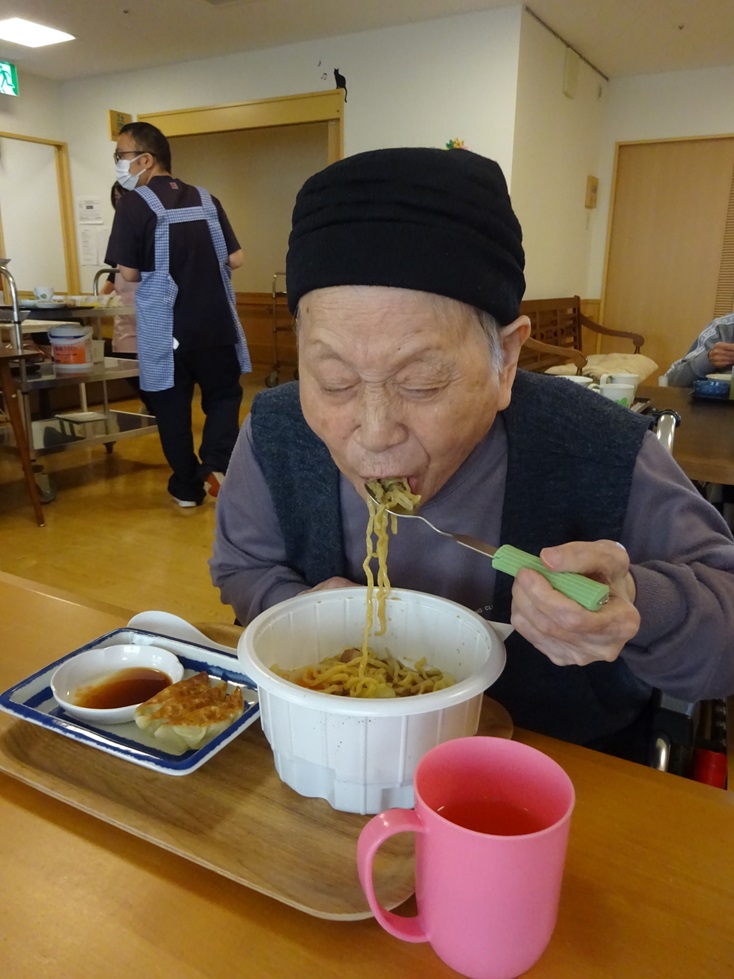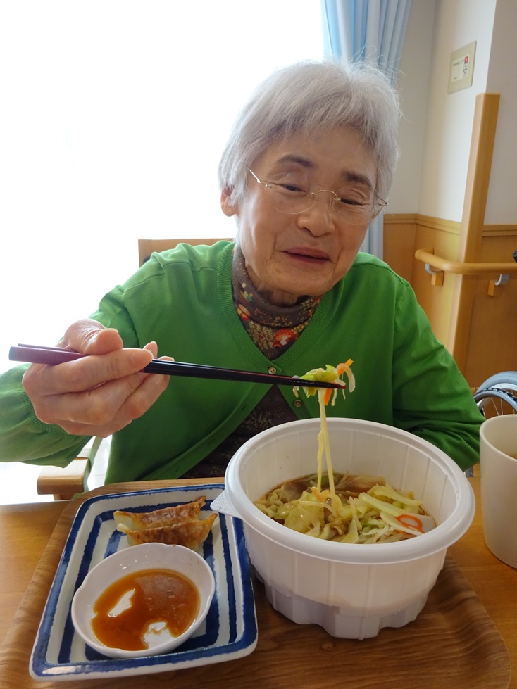 そよかぜホーム東3階ユニットです!ご利用者様から「久しぶりにラーメン食べたい」とご希望がありましたので、野菜ラーメンと餃子をテイクアウトをして昼食に食べました(*’ω’*)
