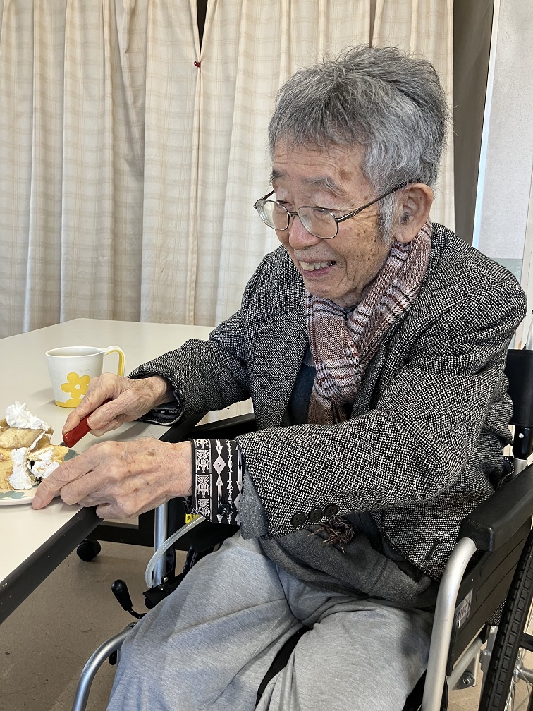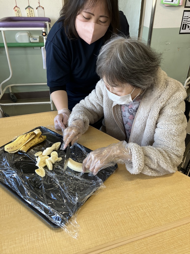 皆さんにバナナやイチゴを切ってもらったりクリームを塗っていただきました。