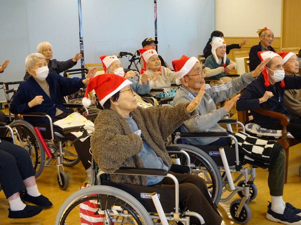 赤鼻のトナカイに始まり、音楽レクレーションでは氷川きよしさんの青い山脈、きよしのソーラン節を皆で踊り、ディスコタイムではステインアライブで身体を動かして「きよししこのよる」五木ひろしさんの「夜空」「空に太陽があるかぎり」を合唱し、最後は坂本九さんの「見上げてごらん夜の星を」で締めくくりました。涙ぐむ利用者さんについこちらももらい泣き(´;ω;`)ウッ…