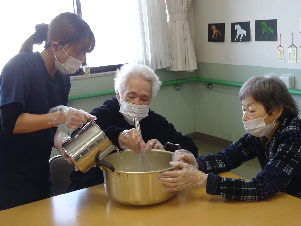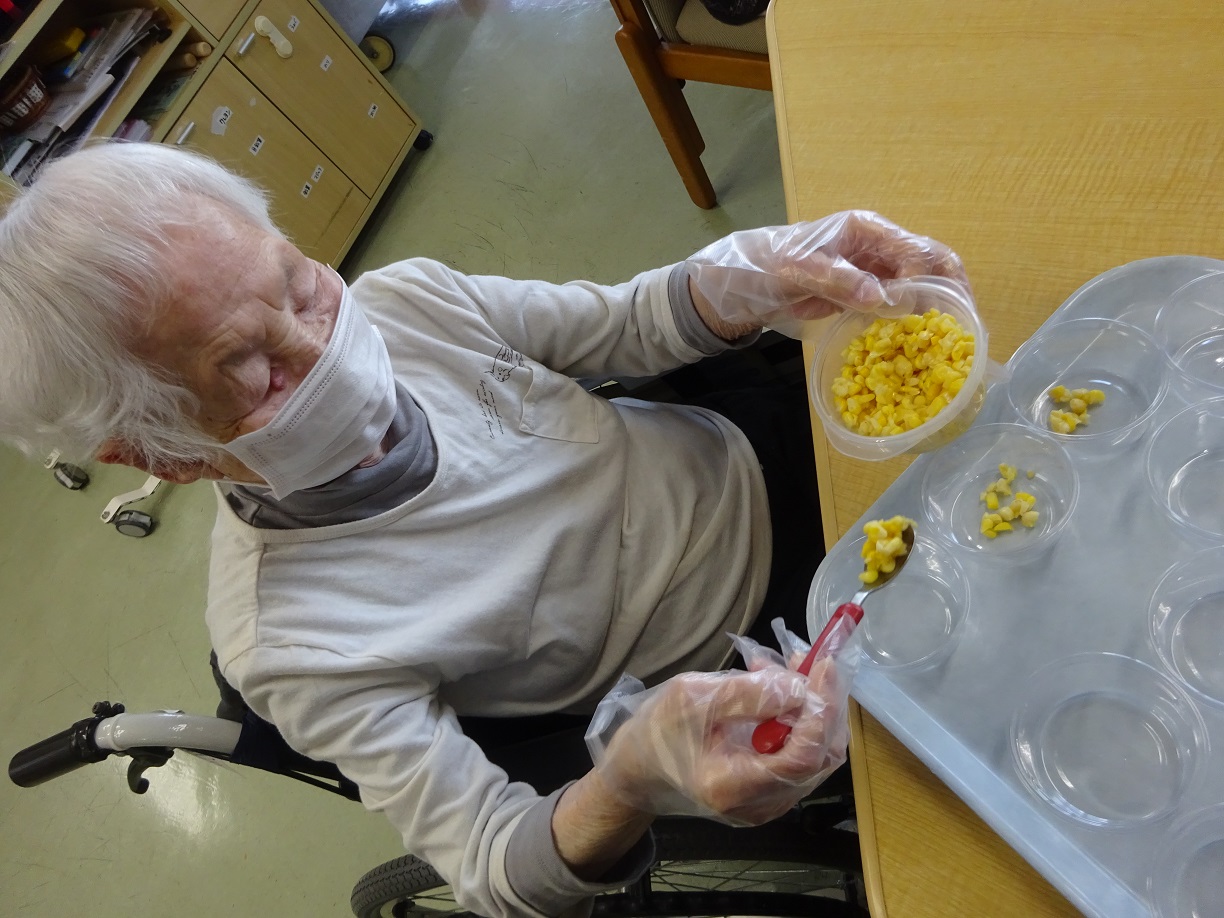 こんにちは。今月のフロア行事で「カノムタゴ」というタイのお菓子を作りました。珍しいタイのお菓子が食べられるとあって、利用様もとても嬉しそうな様子でした。皆様とても上手に鍋でココナッツミルクを入れたり、材料を混ぜたりしていました。おやつの時に提供を行い、皆様美味しそうに召し上がられていました。