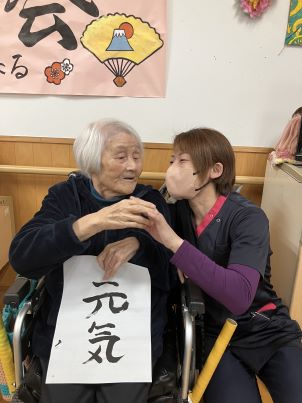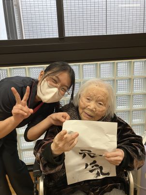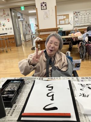 みなさん真剣な顔で丁寧に丁寧に書いており、職員も息を飲みながら応援しておりました。「筆なんて長く握ってないわ~。」、「もう一回書きたい!」、「上手く出来た!」とおっしゃられ、一人ひとり選んだ言葉を筆を握って一生懸命書いておりました。スラスラ~と迷いなく字を書く方もいれば、練習をしてから書く方もいらっしゃいました。書くのが難しい方は職員と一緒に字を書きました。同じ言葉でもそれぞれ違った字体をしており、より良さが生まれ、素敵な作品が出来上がりました!