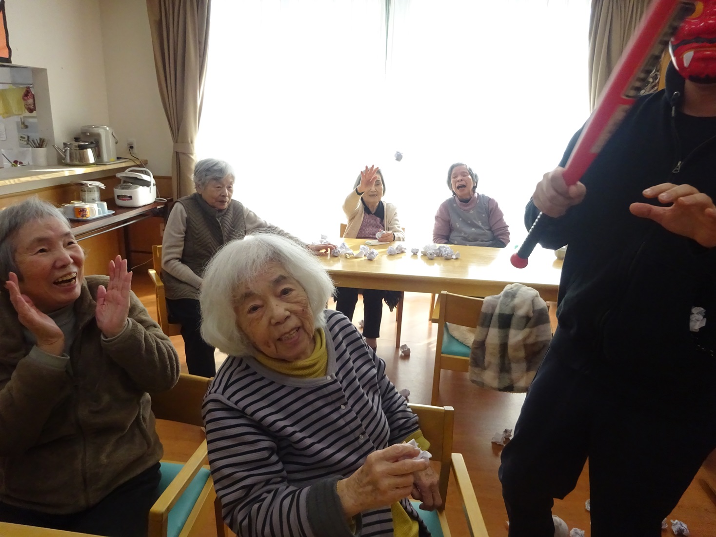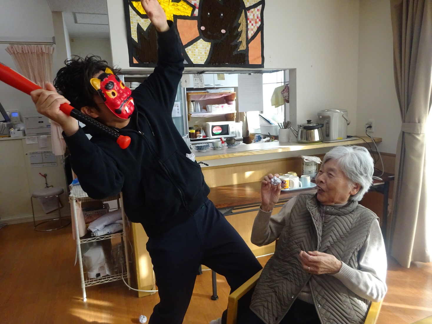 「鬼は外、福は内」新聞を小さく丸め、赤鬼を退治しました。