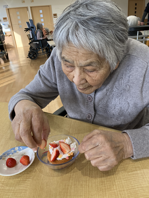 イチゴが食べたいとリクエストがあり、カスタードケーキにホイップとイチゴをデコレーションしていただきました。ケーキが軟らかいのでホイップの絞り口がスポンジに突き刺さったり、ホイップをのせる前にイチゴを口に入れたり、わーわー楽しくプチクッキングに挑戦していただきました!
