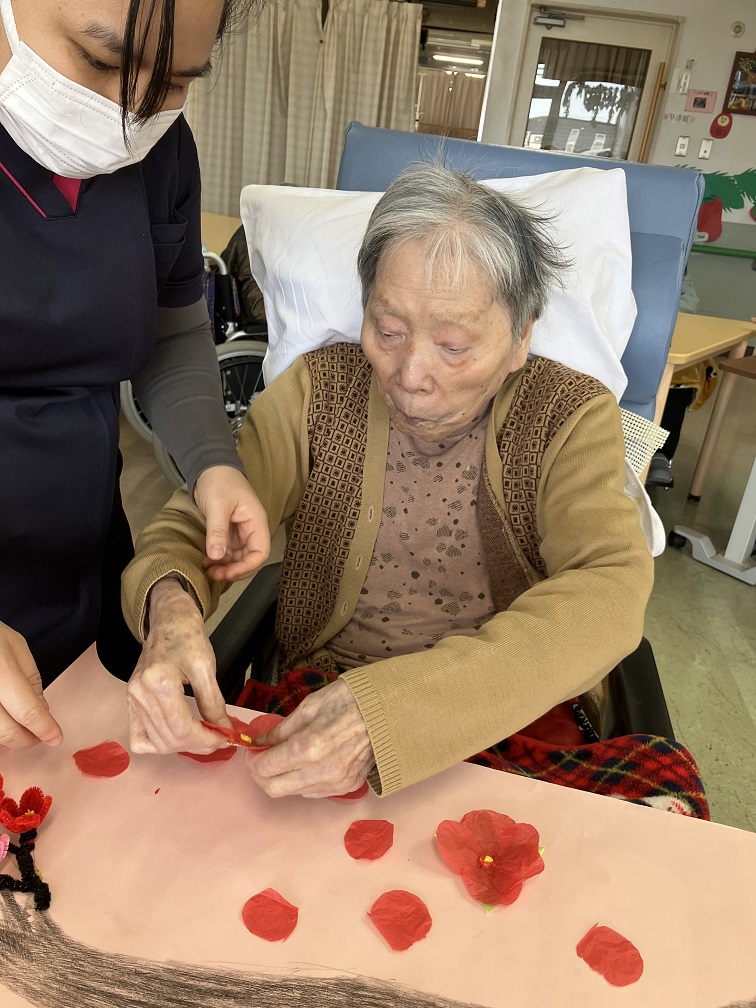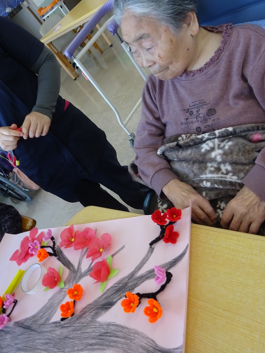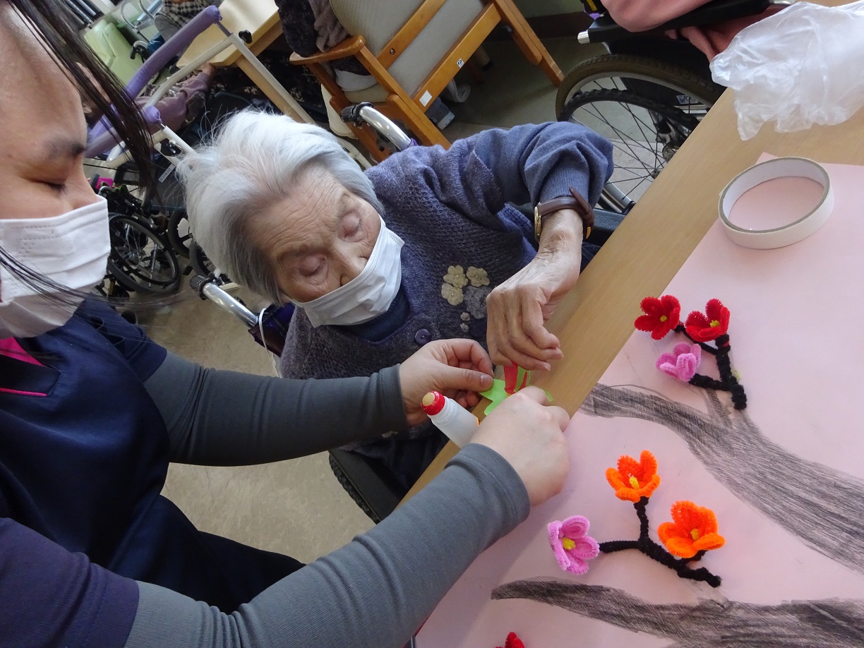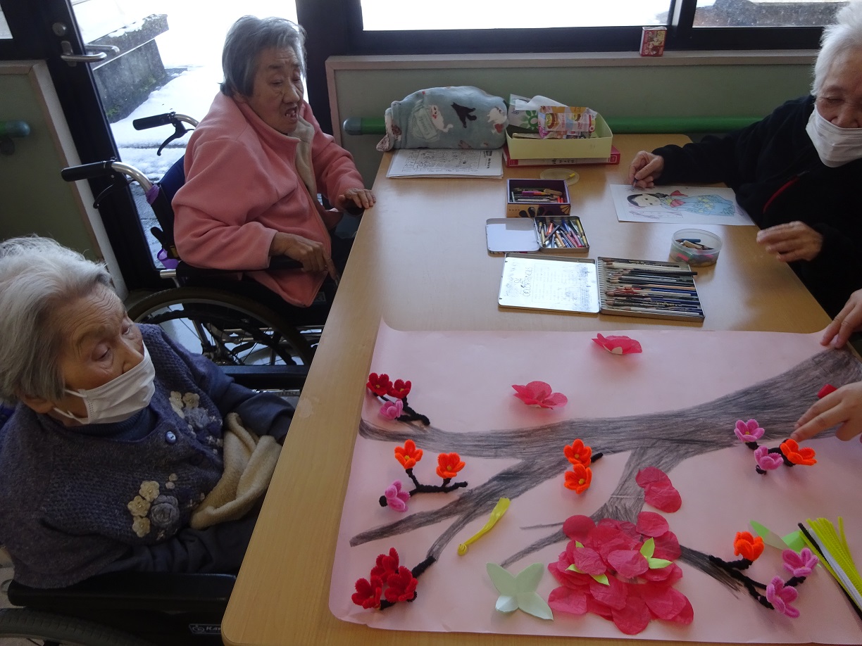 こんにちは。2月になり、梅花が咲き始めます。今日は北2階の食堂で皆さんと一緒に梅花を作ったり生活について話したりと楽しく過ごしました。皆さん「お花綺麗やね」「話は楽しくて面白いね」と言われていました(^^♪