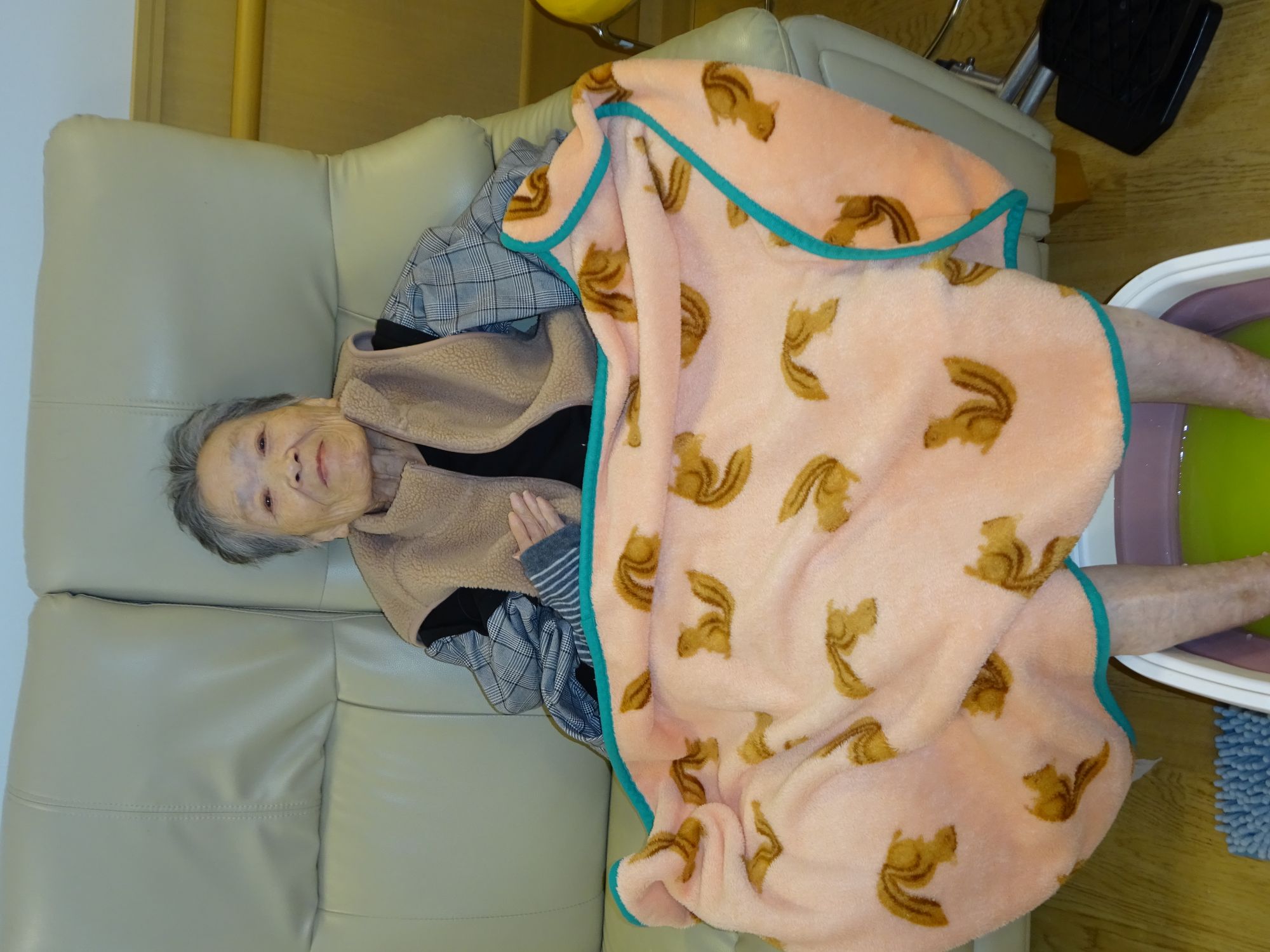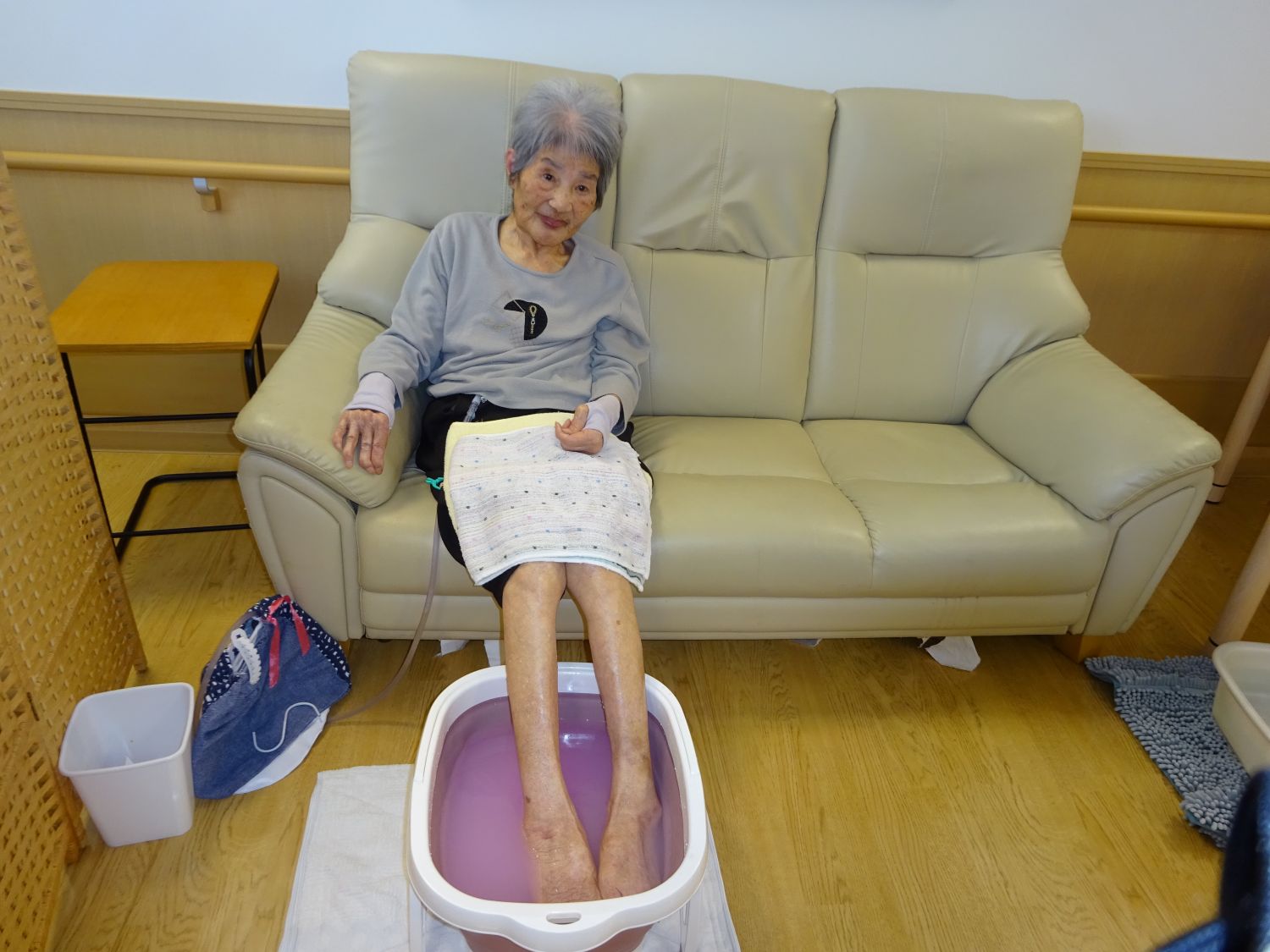 フットケアとして行、浸けるだけの(足湯)ではなく、足全体を洗う(足浴)をしました。清潔に行い、むくみにも効果的。職員が湯加減を確認しながら利用者の足を容器の中にいれました。急に足を入れるとびっくりしたご利用者様もおられました。しばらくすると段々と慣れて気持ちが良いと言われウトウトされる人もいました。10分位してから水分を拭きとり、足全体に保湿クリームを塗りました。皆さん身体が暖かくなったとニコニコ(*^▽^*)