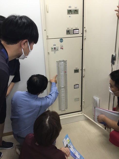 18日に北陸保安協会のそよかぜ担当者を迎えて、緊急時(地震、水害など)の停電に備えた知識と復旧作業の仕方について指導をして頂きました。電気の流れや配電盤の位置および操作の仕方を平時から学ぶことで緊急時でも焦らず行動する、また利用者様に安心して頂けるようにというのが目的です。