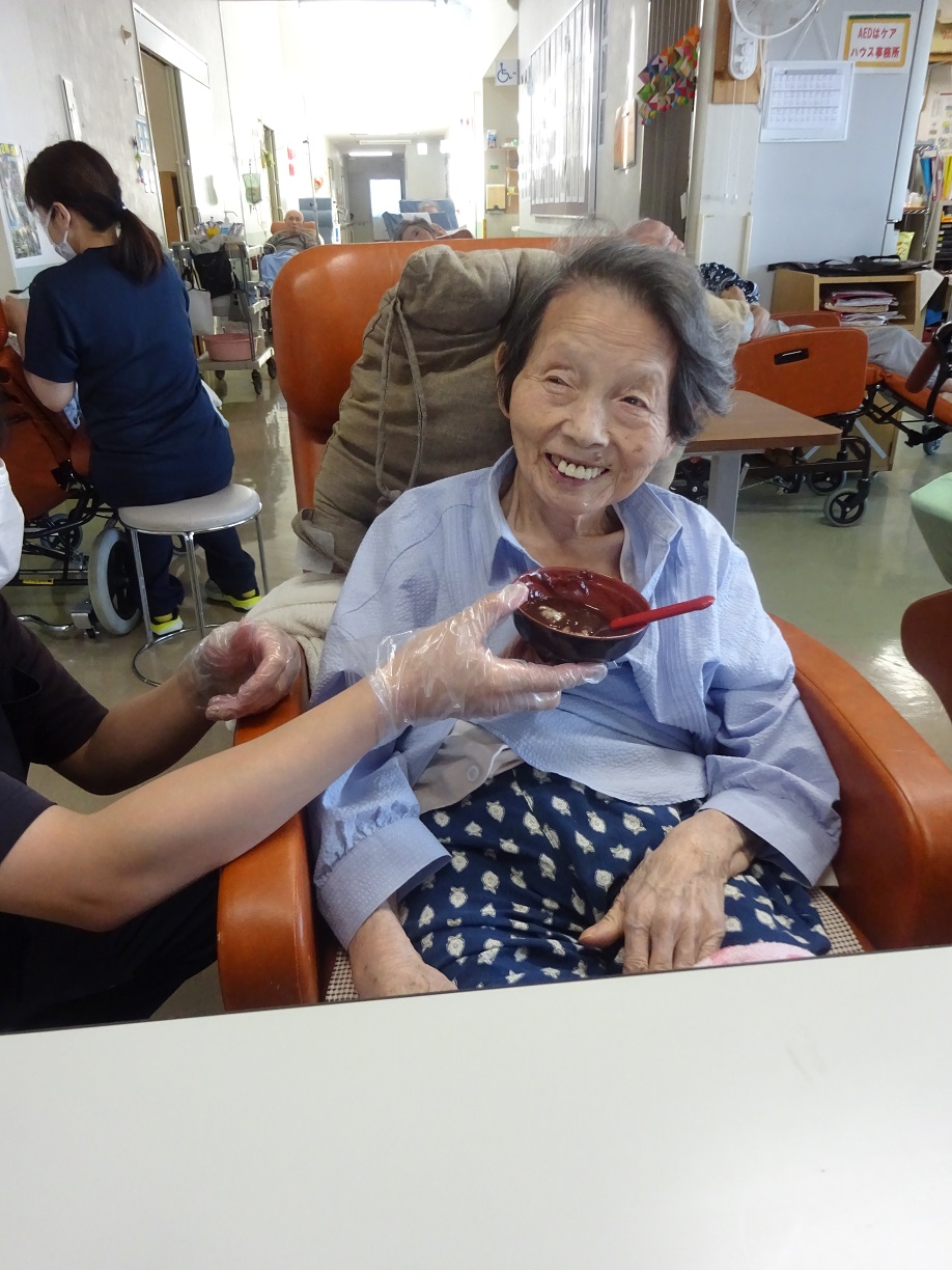 最近肌寒くなってきたためフロア行事にてお汁粉を作りました。皆さんには白玉を作るのは手伝っていただきました。完成したお汁粉は皆さんよほどすぐに食べ終わっておりました。感想を聞くと皆さん笑顔で「美味しかった」と言っていただき嬉しかったです。「また食べたい」と言う声もあるほど好評だったので、機会があったらまた作りたいと思います。