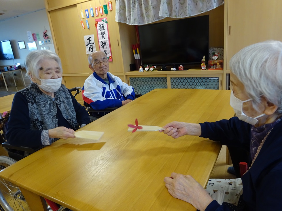 お正月ということで、みなさんで羽子板とかるた大会を行いました。