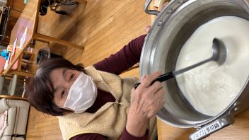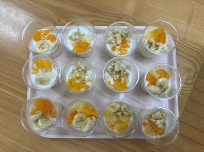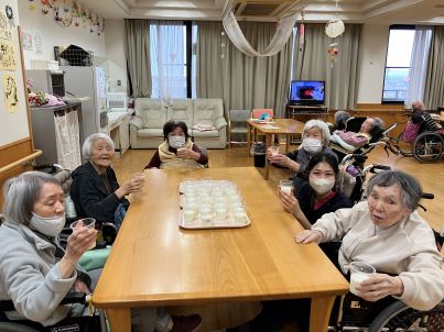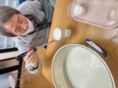 鍋の中にご利用者様がデザートの材料をいれていき、その際、皆様の表情が真剣そのもの。「上手」や「私に任せて」などと、それぞれ皆様の言葉が飛び交い、楽しみながら笑顔がたくさん見られました。完成したフルーツ豆腐プリンを見て、「早くたべたい」「美味しそう」と歓声が上がり、いざ実食!「甘くておいしい」とご利用者様からの言葉に職員も満足!