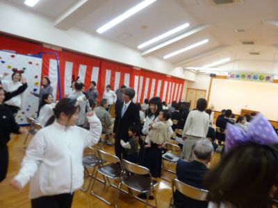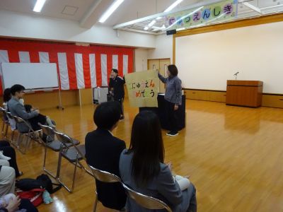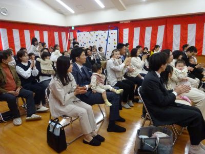 お家の人と一緒に緊張した面持ちで座っている姿が初々しく感じられました。一人一人名前が呼ばれると、大きな声で返事をしたり、お家の人と一緒に返事をしてくれました。