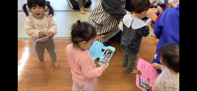 新しいお友だちもにこにこ笑顔で、興味津々に見たり、体を動かしていました。