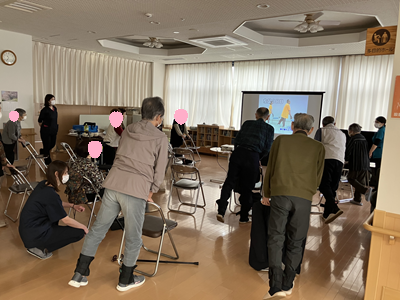 地域の方と一緒にケアハウス1Fロビーにて百歳体操を行いました。体を動かす機会の少ないご入居様も参加されとっても好評でした。これを機に少しでも体を動かしいつまでも元気でいられますように・・・