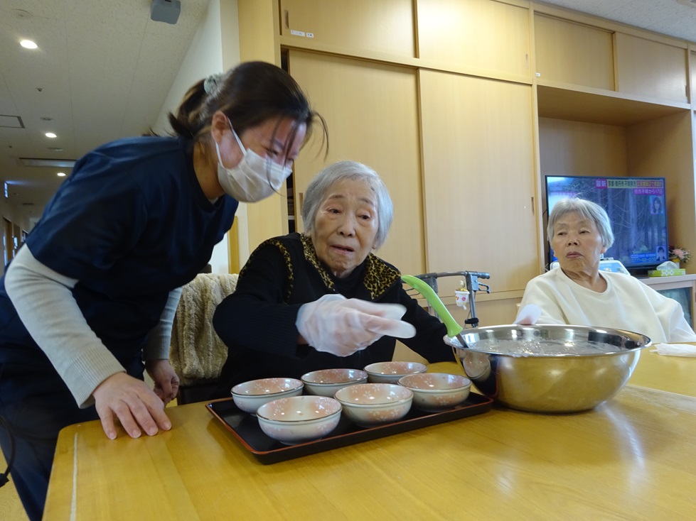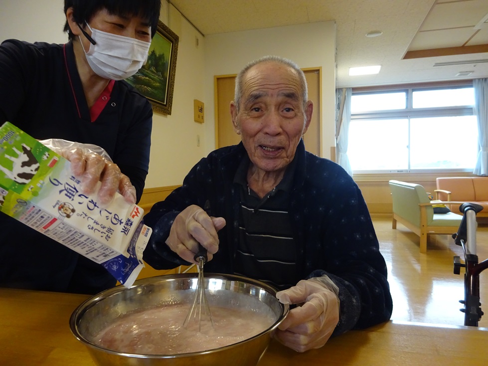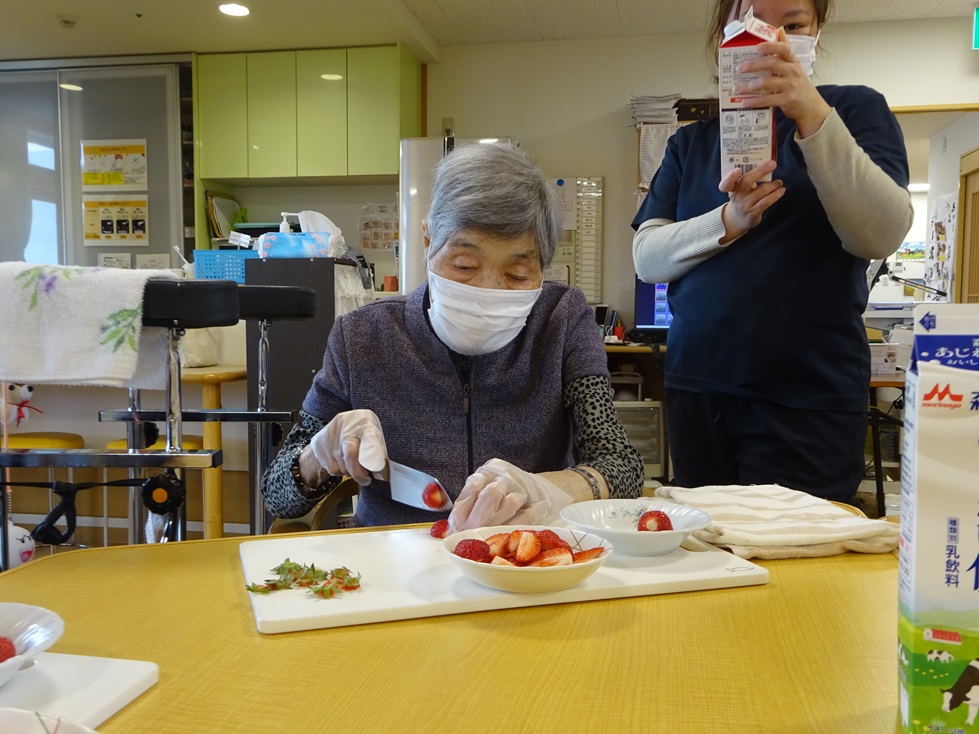 いちごのカット、フルーチェ混ぜ、盛り付け全てをご利用者様にしていただきました!
